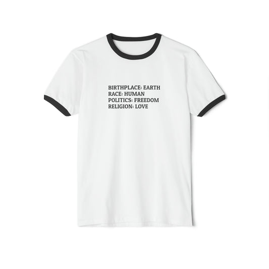 'Birthplace: Earth, Politics: Freedom, Religion: Love' Cotton T-Shirt