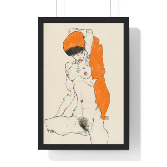 Standing Nude with Orange Drapery (1914) Line Art by Egon Schiele from the Original, Framed Art Print