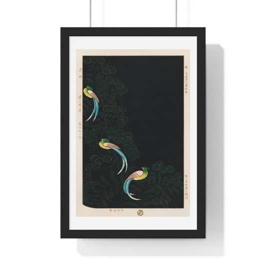 Traditional Illustration Lithograph of Kimono Design, Three Colourful Birds in a Black Background, from the Original, Framed Art Print