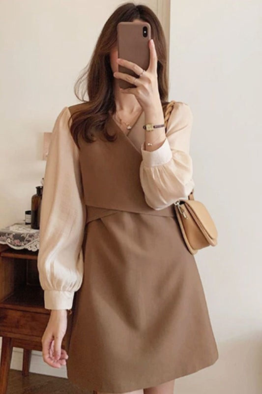 Vireous Contrast-Colour Spliced Halter Belt Dress