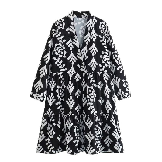 Vireous Long Sleeve Geometric Print Polo Collar Dress