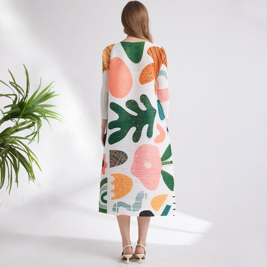 Vireous Nature Leaf Print Comfortable Pleated Fashion Dress