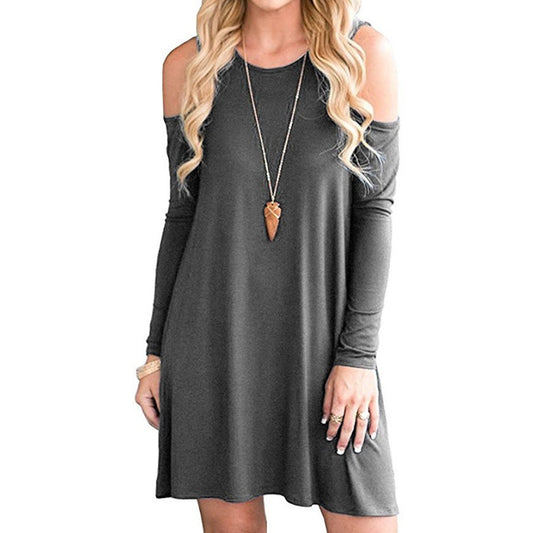 Vireous Solid Colour Off-the-Shoulder Long Sleeve Dress