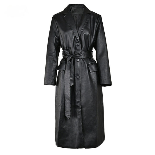 Vireous Waist-Tight Thin Black PU Leather Women's Coat
