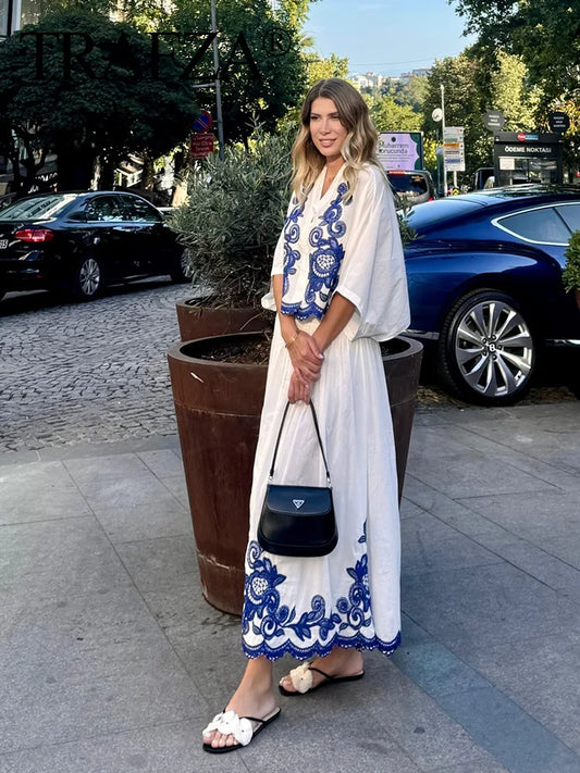 Bohemian-Style White and Blue Embroidered Two-Piece Women's Summer Set