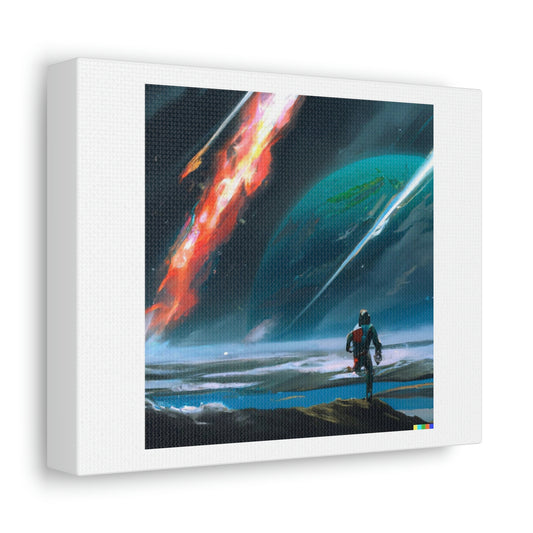 Running At The Edge Of Space Toward A Planet Reaching The Abyss Digital Art 'Designed by AI' on Satin Canvas