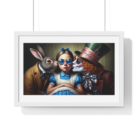 In Wonderland’s Soft Lantern Glow, Alice Receives a Kiss from Rabbit and Hatter 'Designed by AI' Framed Art Print