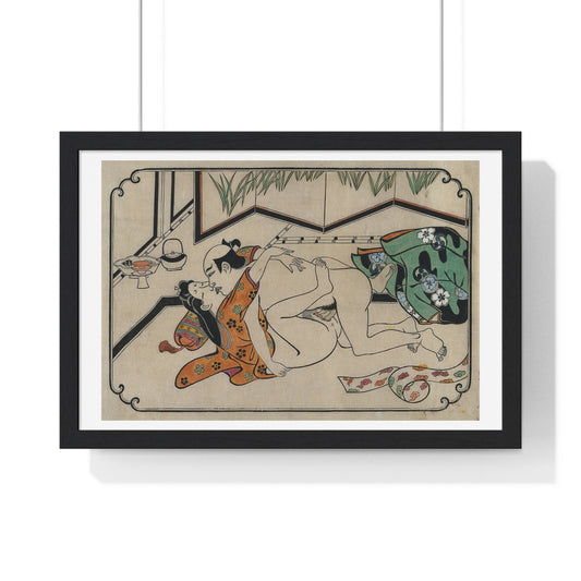 Middle-Aged Couple Making Love, Coloured Reproduction of a Woodcut by Moronobu (1680s) Framed Art Print