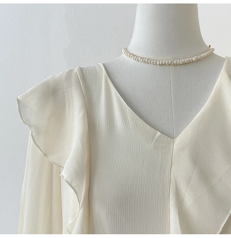 Features: v-neck, mid-length chiffon for a light and soft feeling.