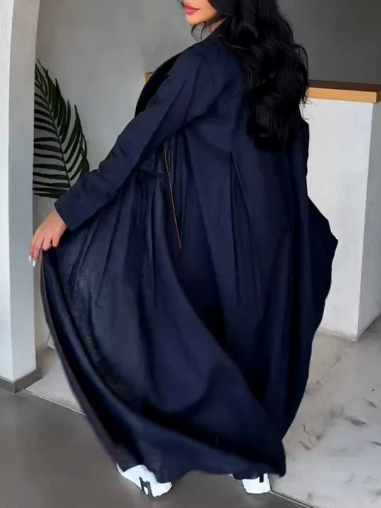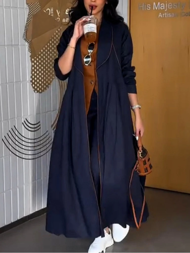 Features: autumn and winter collection, fashion, contrast-trim open front long coat, pockets, pleated