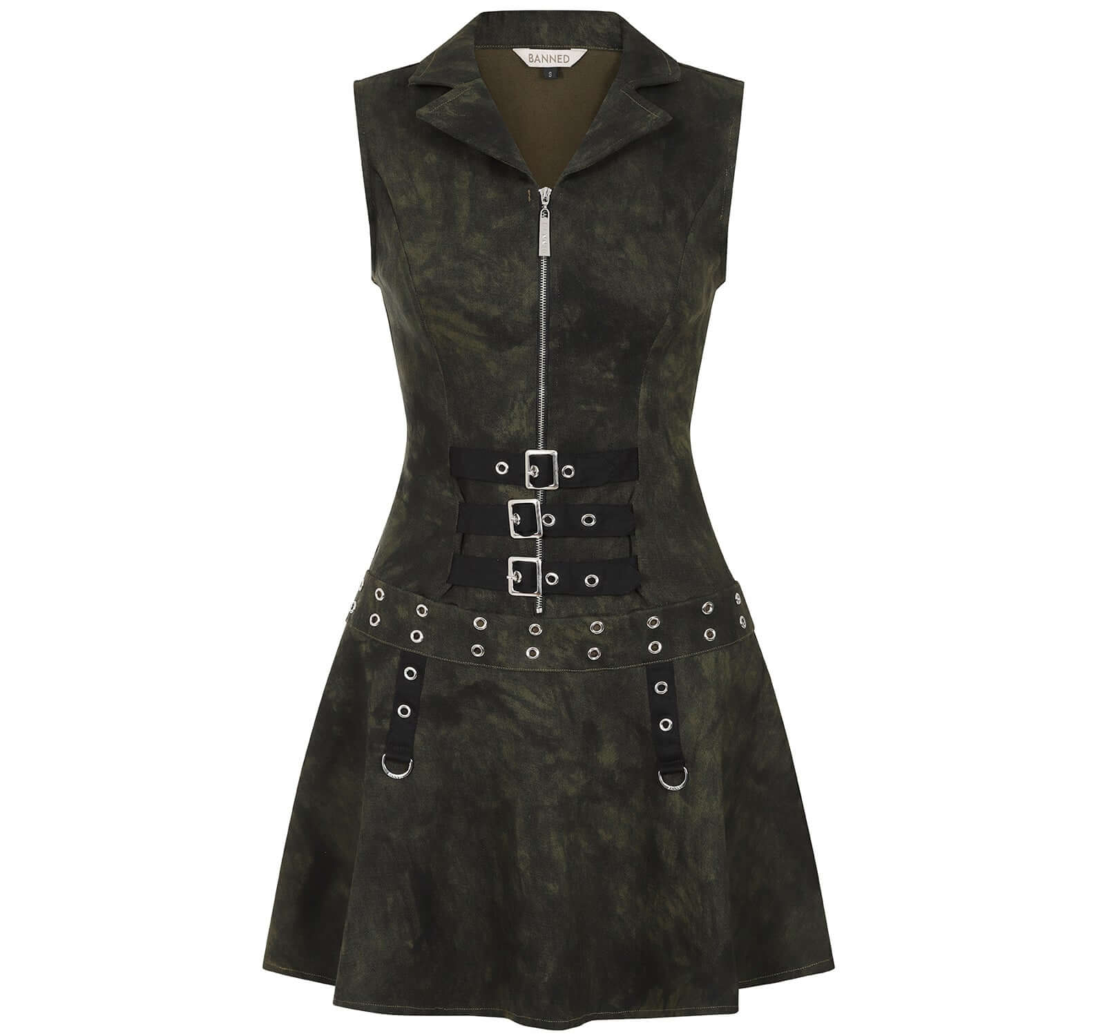 Adding to its punk-inspired charm are grommet and ring details along the waistband and hem. The skirt is adorned with black strap accents and metal rings, adding even more rebellious flair. The fitted bodice seamlessly flows into a flared A-line skirt, creating a perfect balance of style and wearability. This dress effortlessly combines military-inspired elements with a modern, rebellious attitude, perfect for those who embrace bold and confident fashion choices.