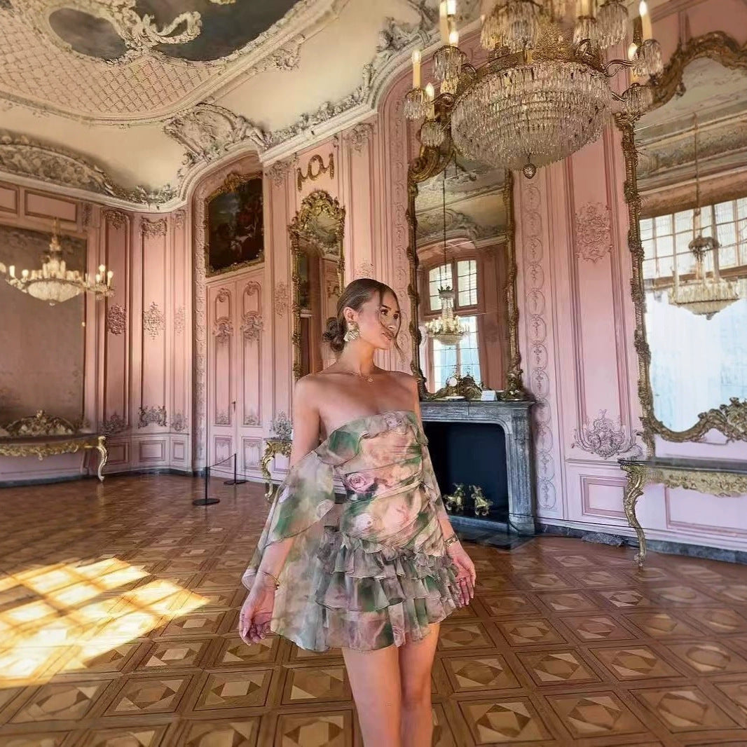 Chiffon Abstract Printed Ruffles Tube Dress