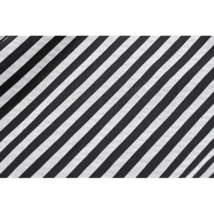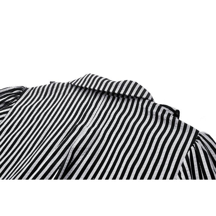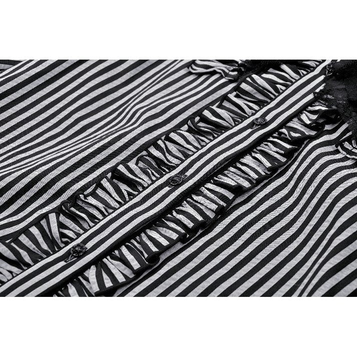 Get ready to rock the Gothic Lolita look with the Dark in Love Elsbeth Blouse. This unique piece features a removable lacey collar adorned with a skull pendant, adding a touch of edge to the classic black and white striped brocade fabric. The gently belled sleeves and ruffle trim on the front complete this must-have for fashion rebels.