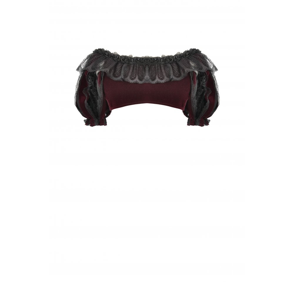 Elevate your gothic elegance with the Dark in Love Isolde Velvet and Lace Puff Sleeve Bolero. Crafted from sumptuous black lace layered over rich wine-red velvet, this cropped bolero features soft puff sleeves and intricate lace edging for a dramatic, romantic finish.