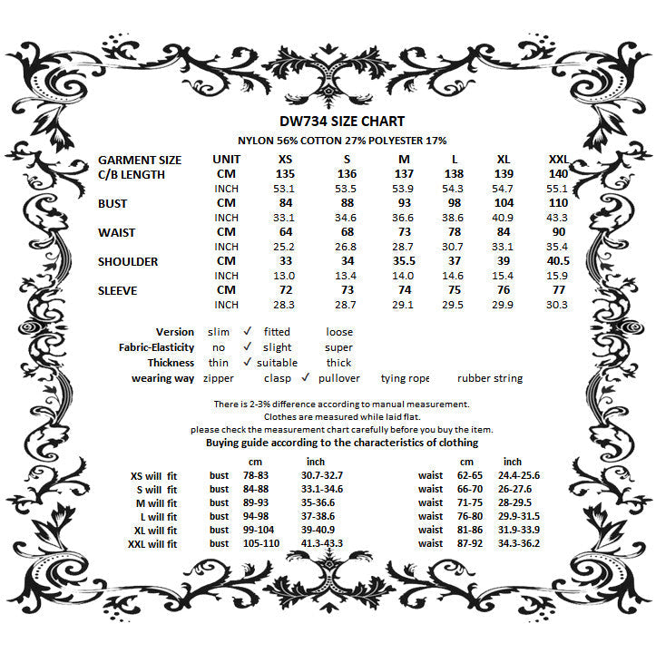 The Dark in Love size guide in the images provides the perfect fit for the wearer. The pointed collar adds a touch of elegance to the coat, while the ruffle detail adds a feminine touch. The gothic style of the coat is sure to turn heads and make a statement wherever the wearer goes.