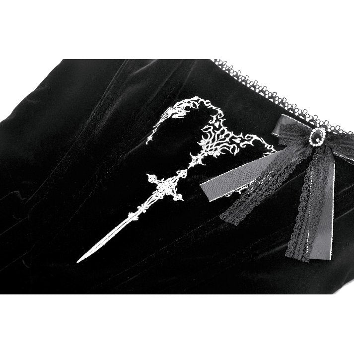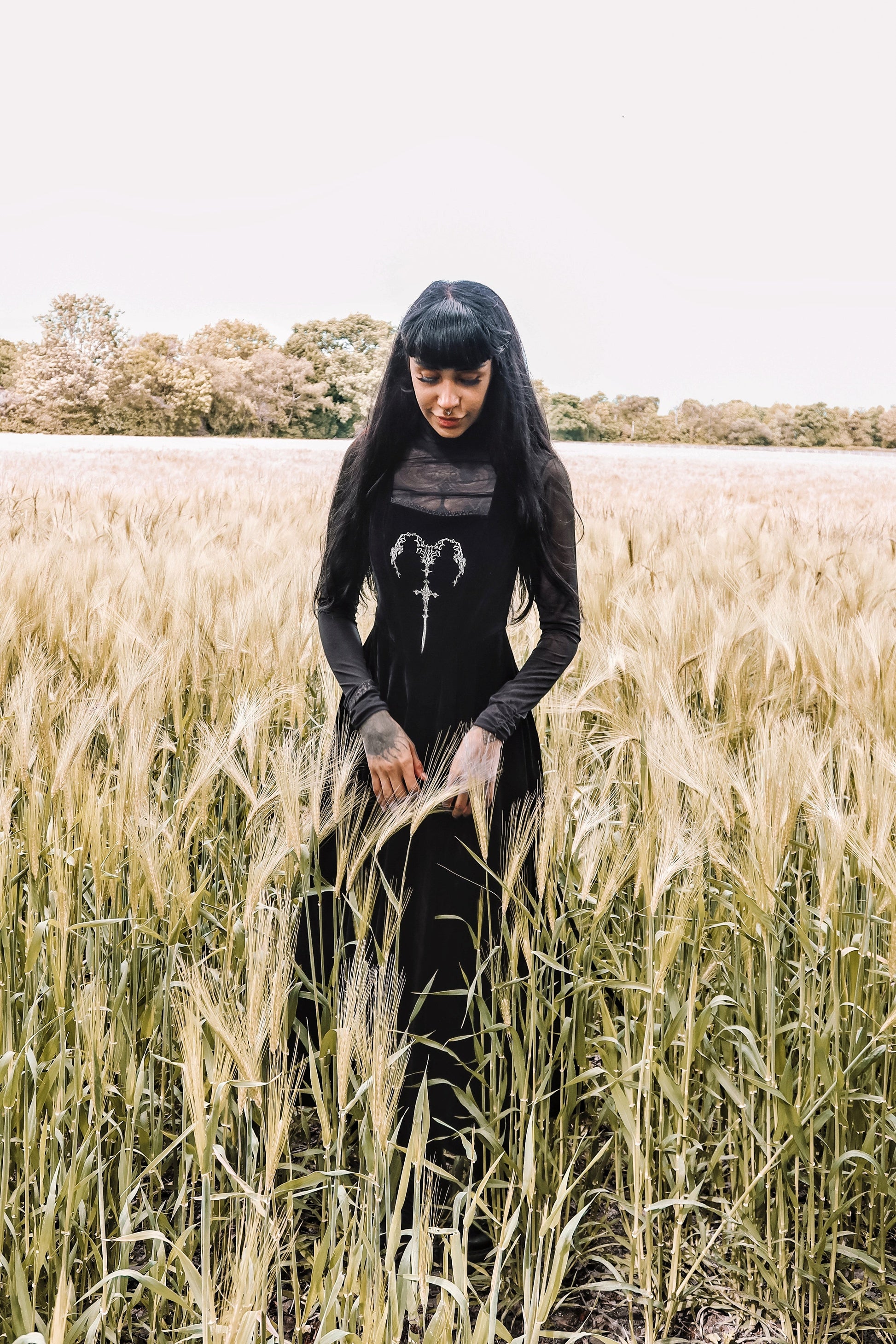 Made from luxurious velvet, this gothic-inspired dress features a square-neck design with intricate embroidered details. Elevate your style with this maxi dress and make a statement at any event.