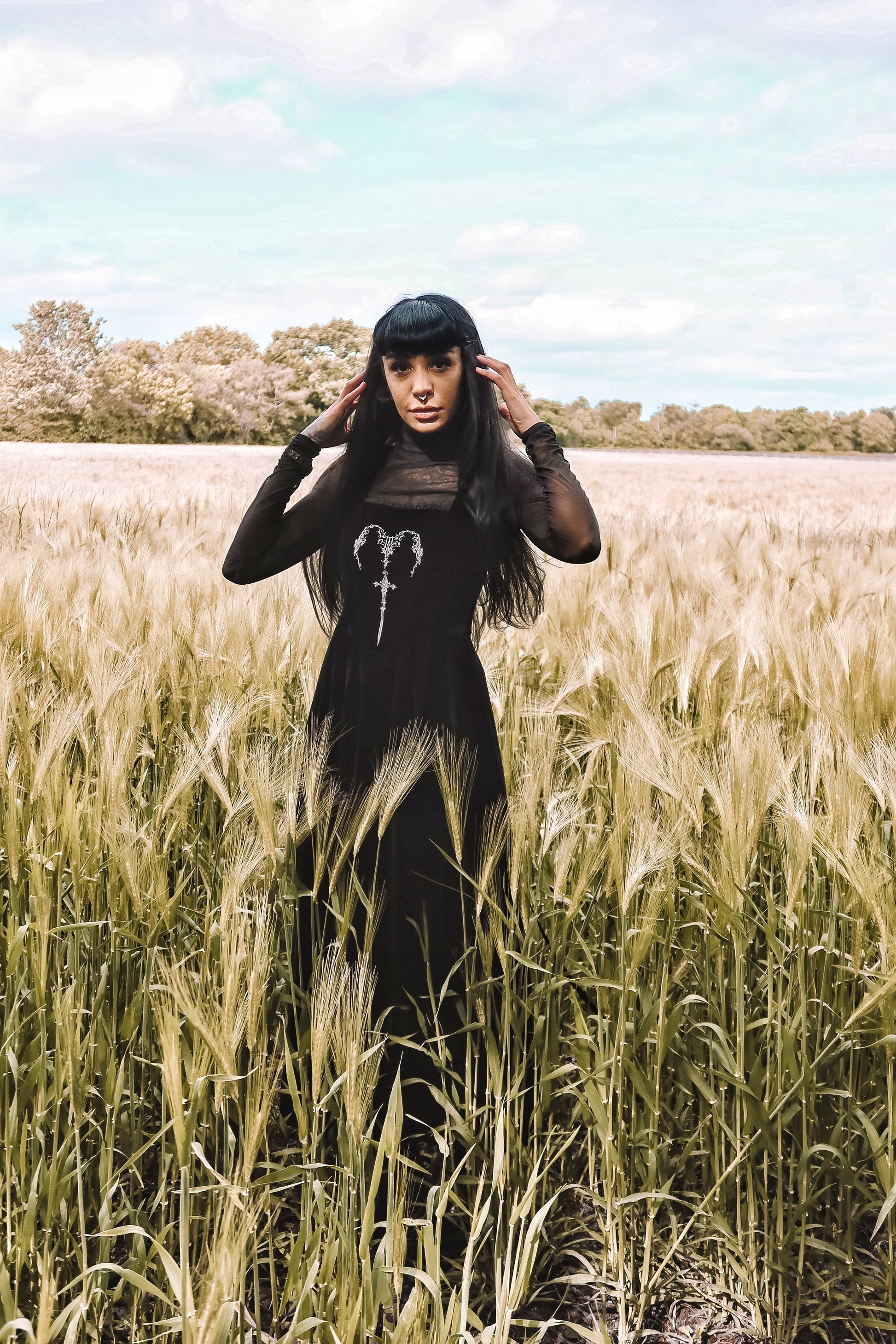 Dark in Love Lux Black Velvet Horn Embroidery Maxi Dress