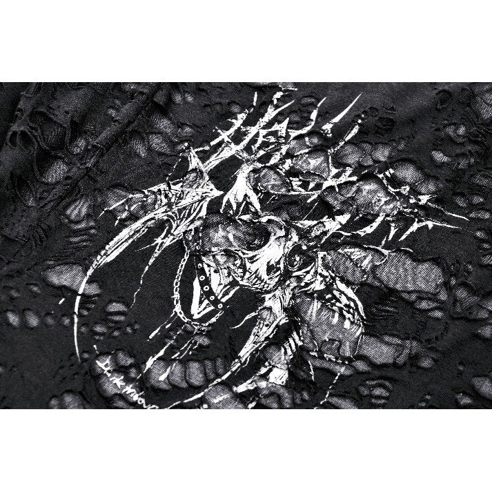 Unleash your rebellious spirit with the Dark in Love Yvette Tank Top. This punk-inspired piece is made from shredded black lace fabric, featuring a gothic graphic print on the front and unique metal buckle details on the shoulders. Its distressed design and asymmetrical hemline make it a must-have for alternative fashion lovers.