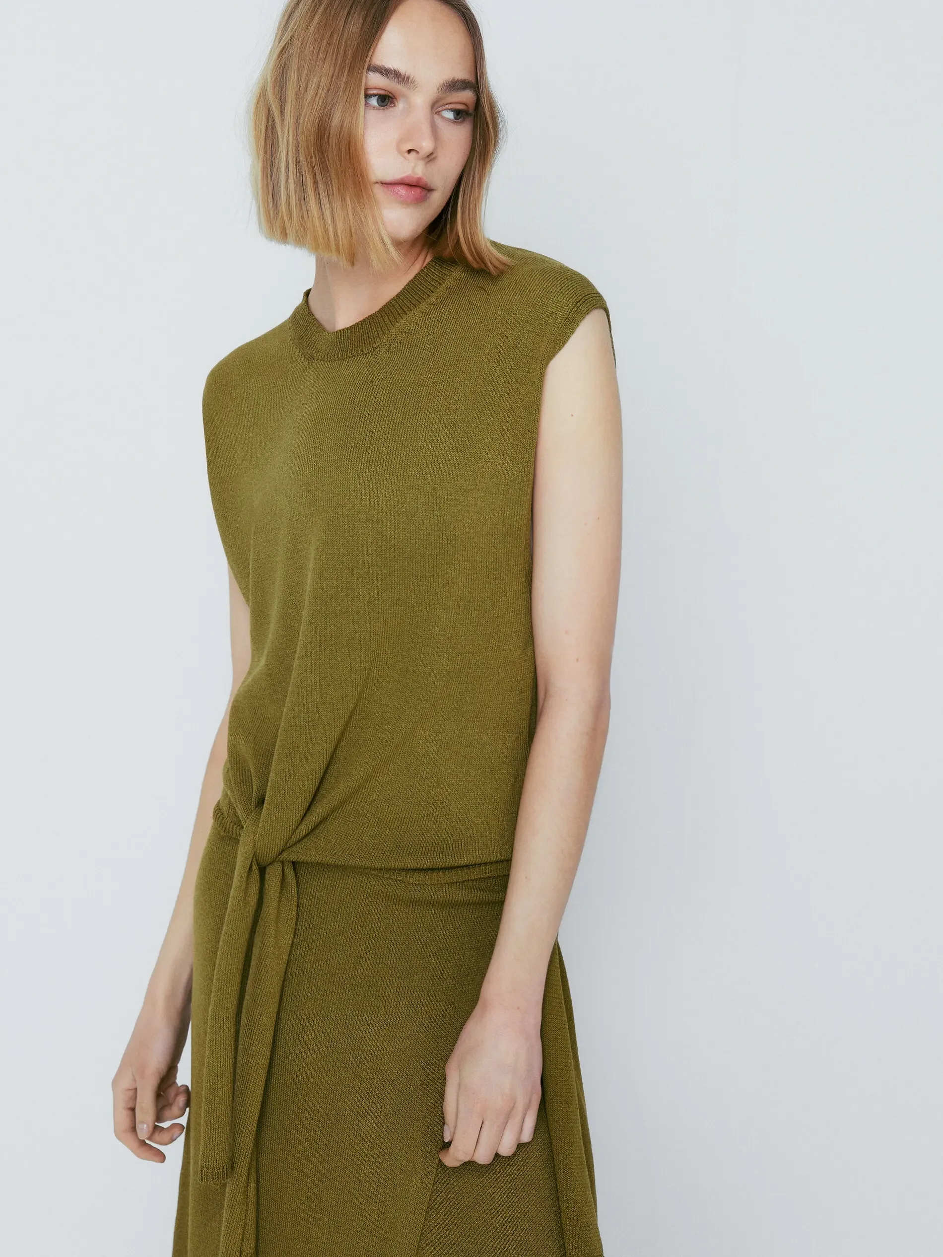 Vireous Women's Fashion Knitted Side-Knot Sleeveless Army Green Sweater