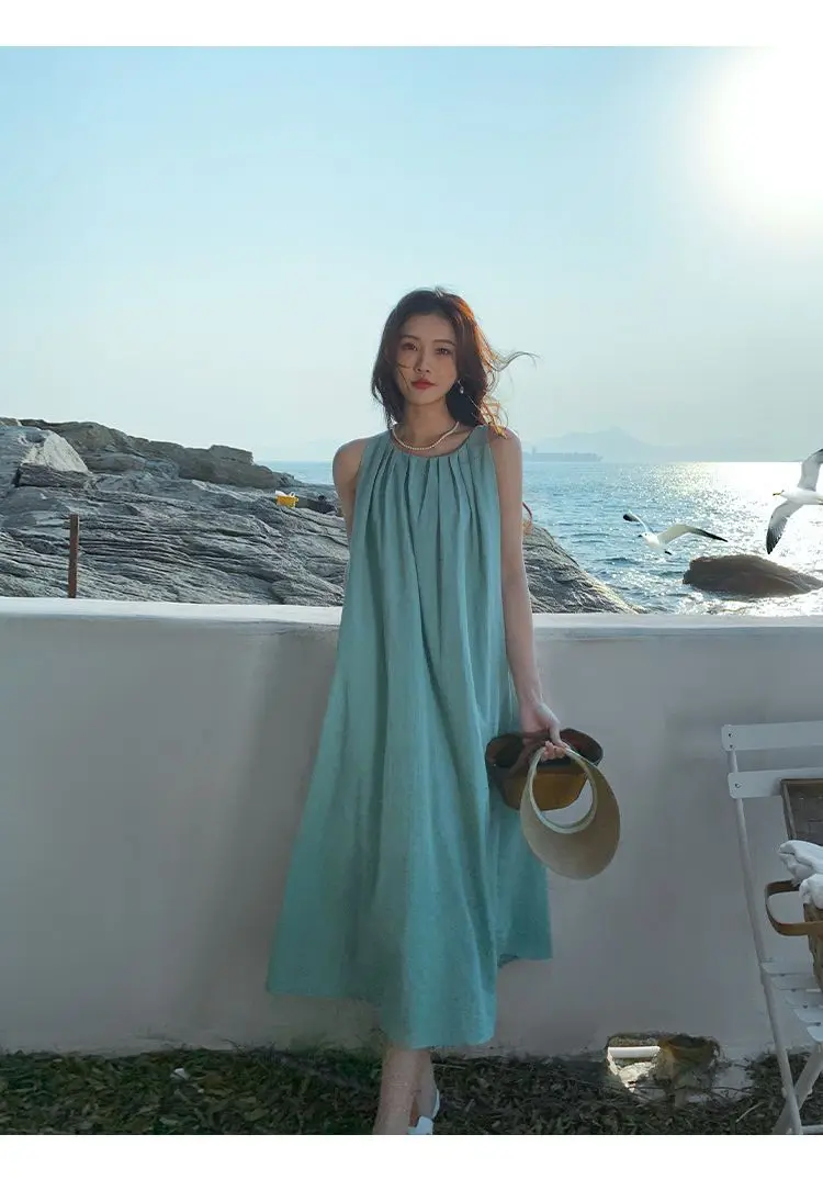 Here is our beautiful lightweight, sleeveless, hanging ruched o-neck, suspender dress, long dress in aqua blue. This colour is perfectly flattering against skin colour. Simple and generous fashion. Cutaway at the back adds a touch of formality.