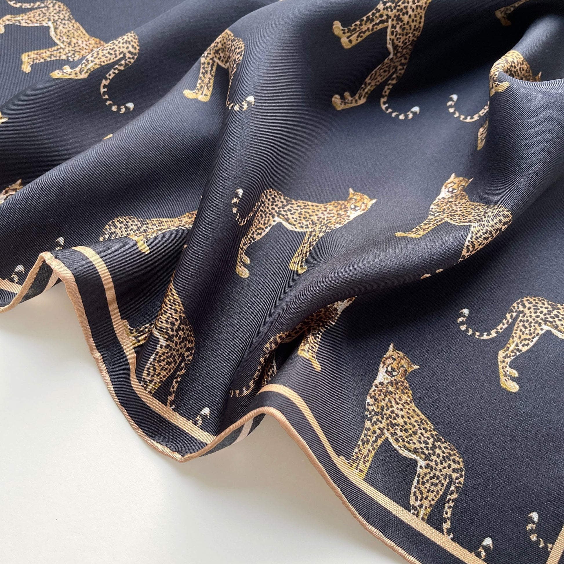 Elevate your style with our leopard print silk scarf, available in pink, sky blue, and black. Crafted from luxurious silk twill with hand-rolled hems, this versatile square scarf adds a pop of colour to any outfit, whether for special occasions or everyday wear - a timeless accessory that blends craftsmanship with style.