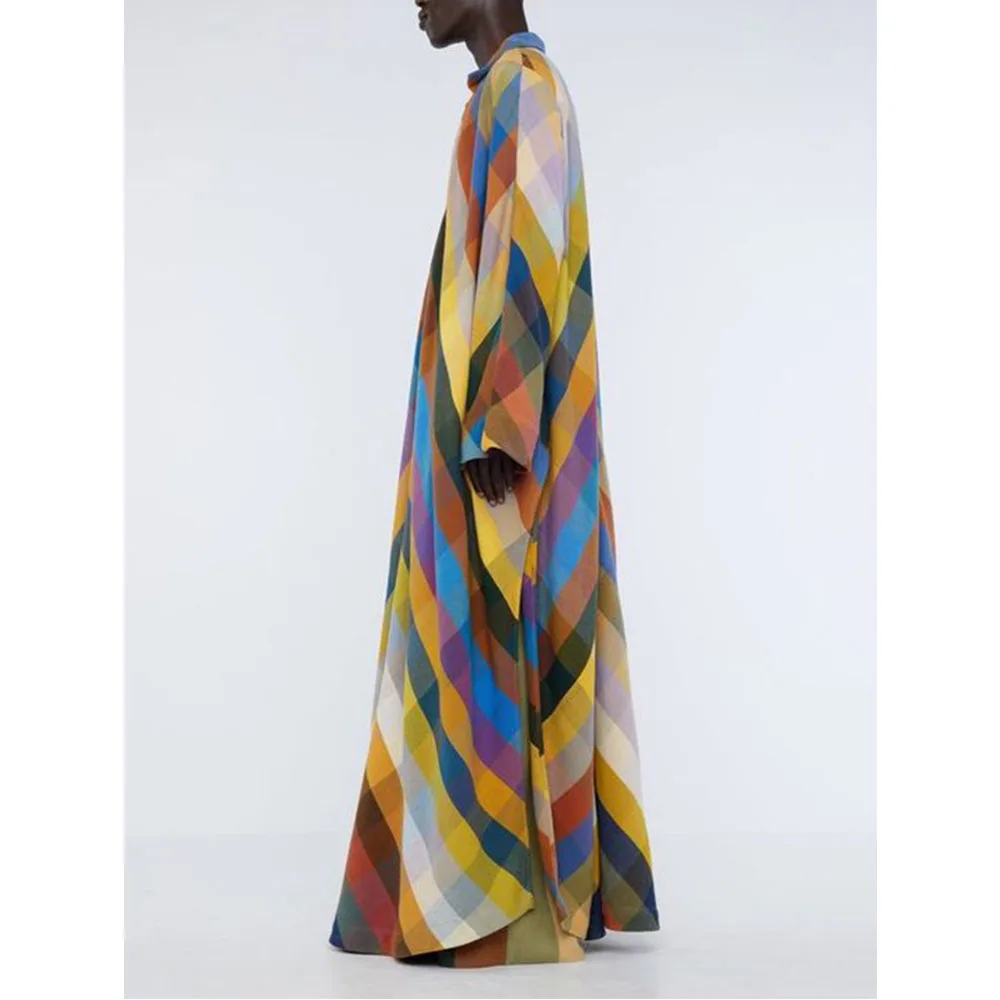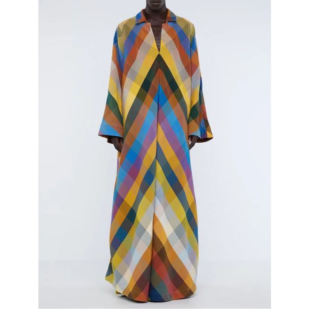 Vireous Long Sleeves Loose Geometric-Print Split-Side Maxi Dress