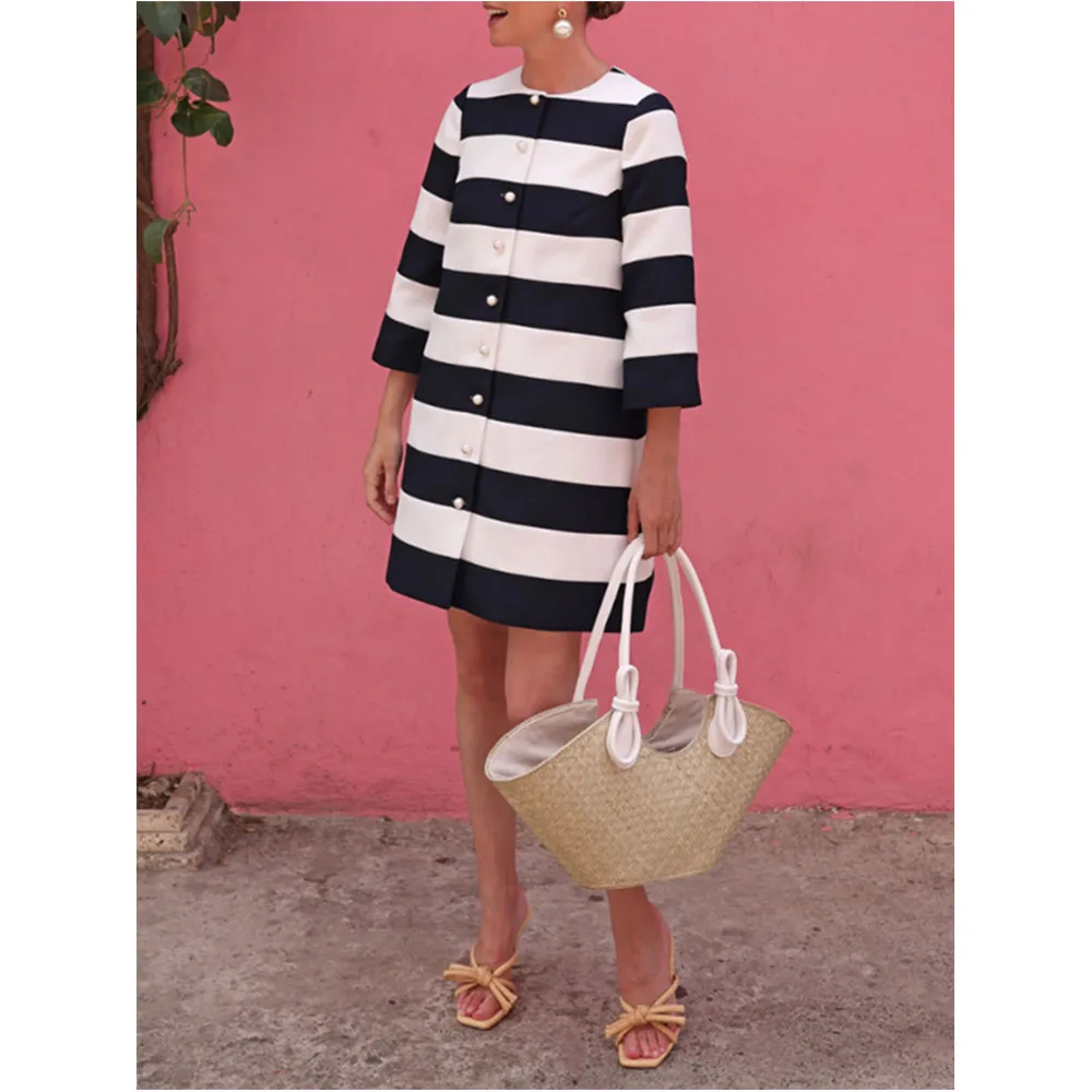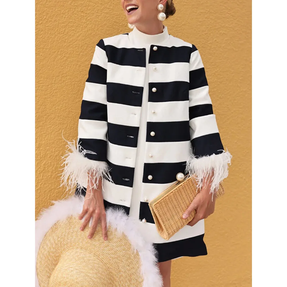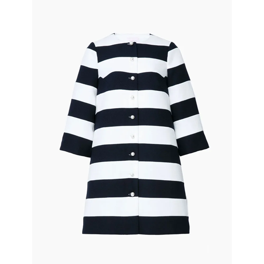 Features: stunning, buttoned round-neck short coat with bold stripes