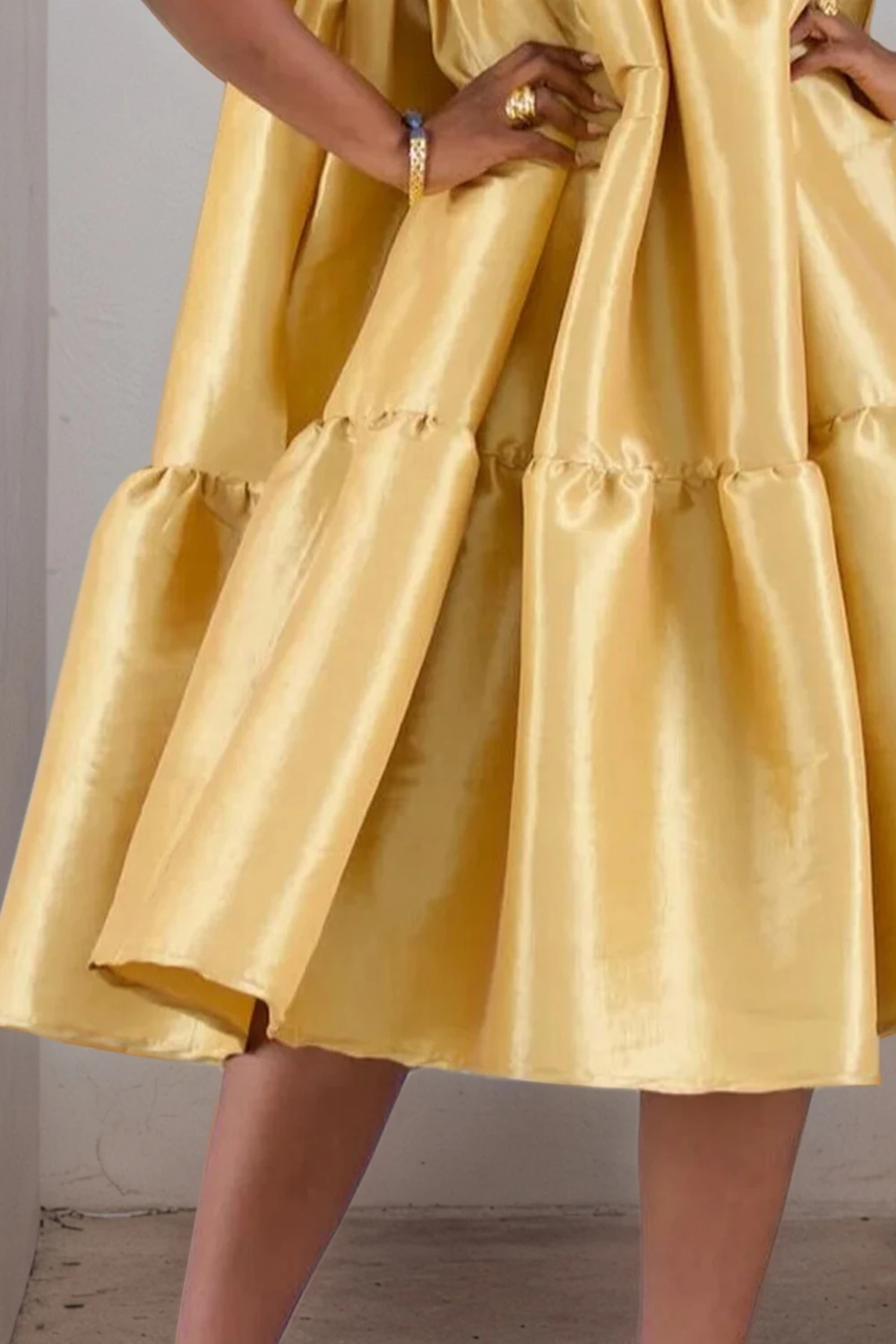 Features: bold gold luxurious satin midi dress, loose fit, tiered skirt, bright and summery