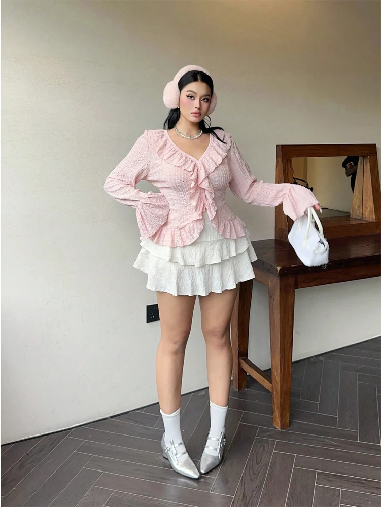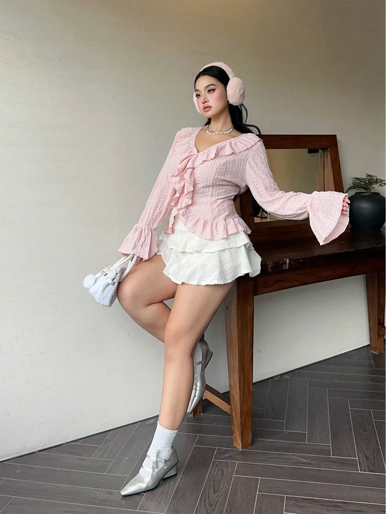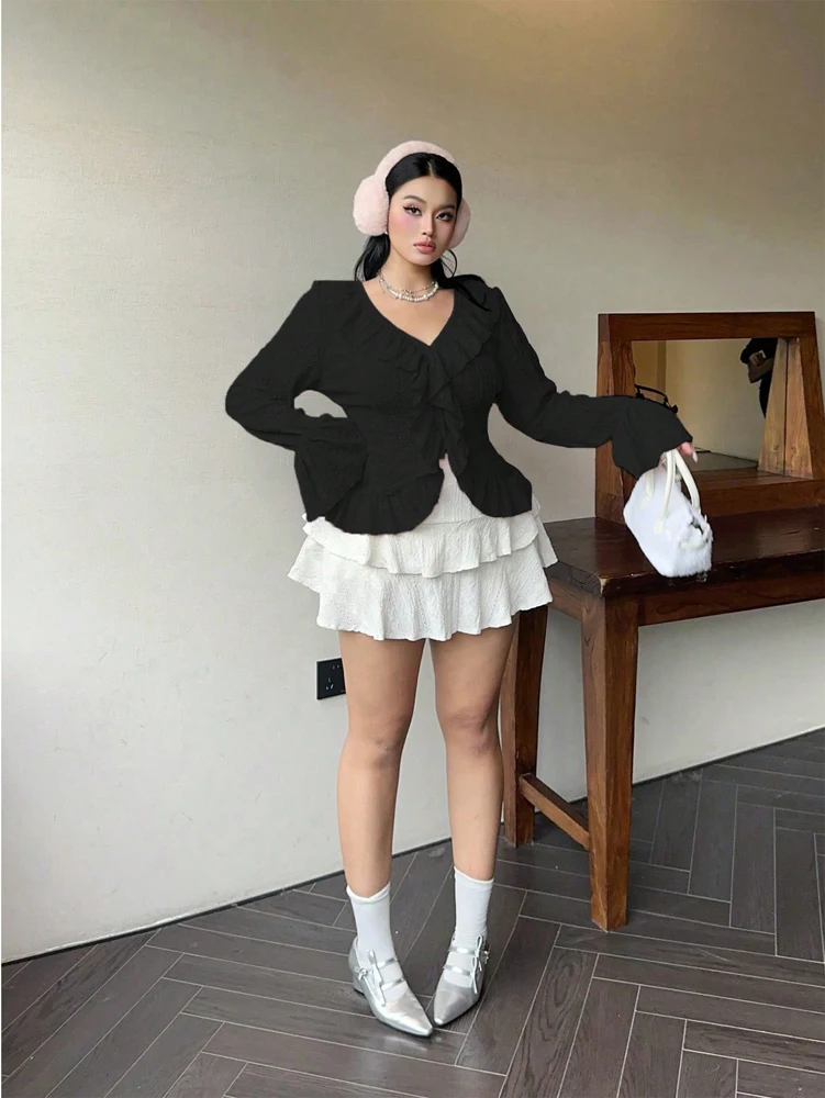 Features: plus-size, v-neck, sweetheart, bubble sleeve, elegant top with dramatic ruffled hem, cuffs and collar