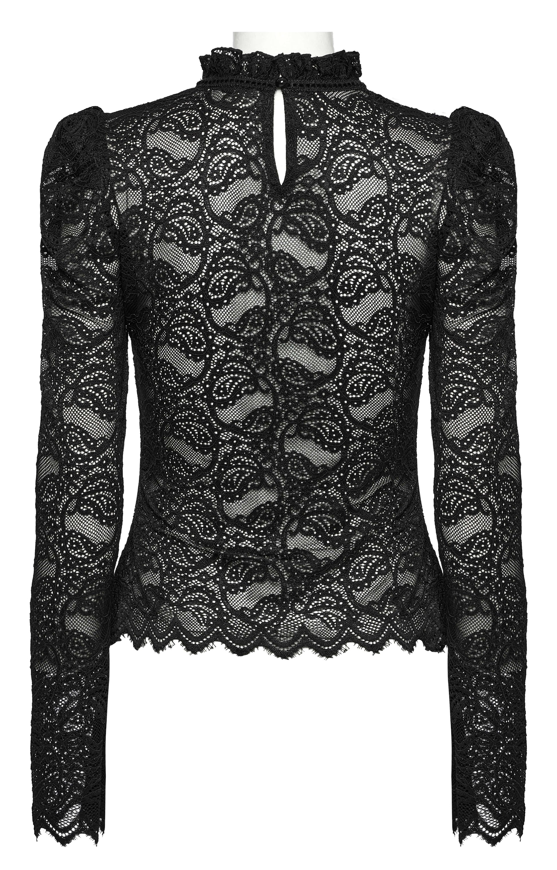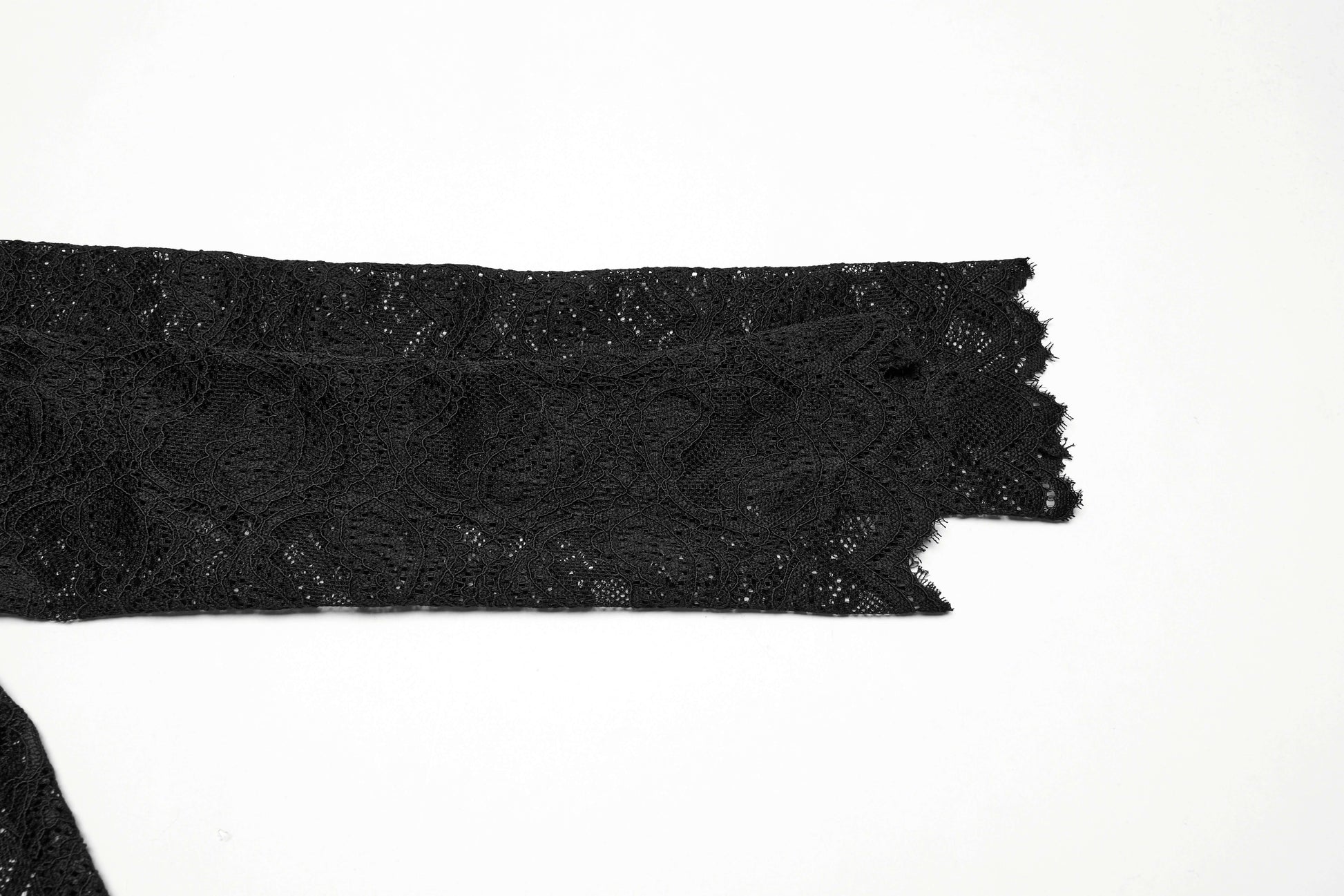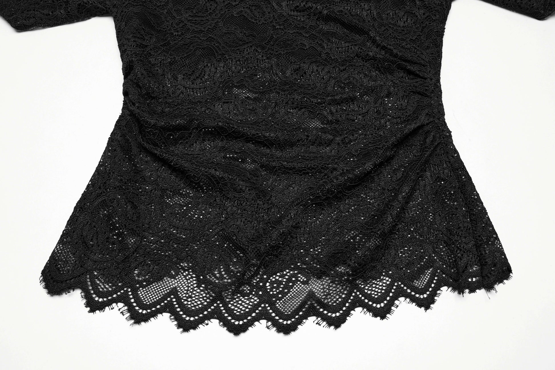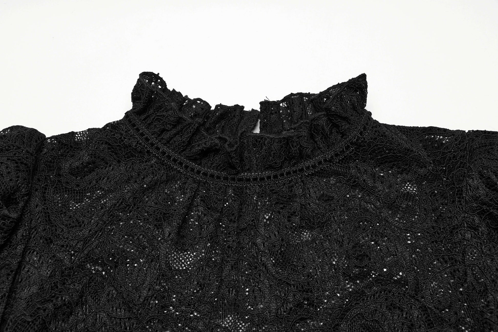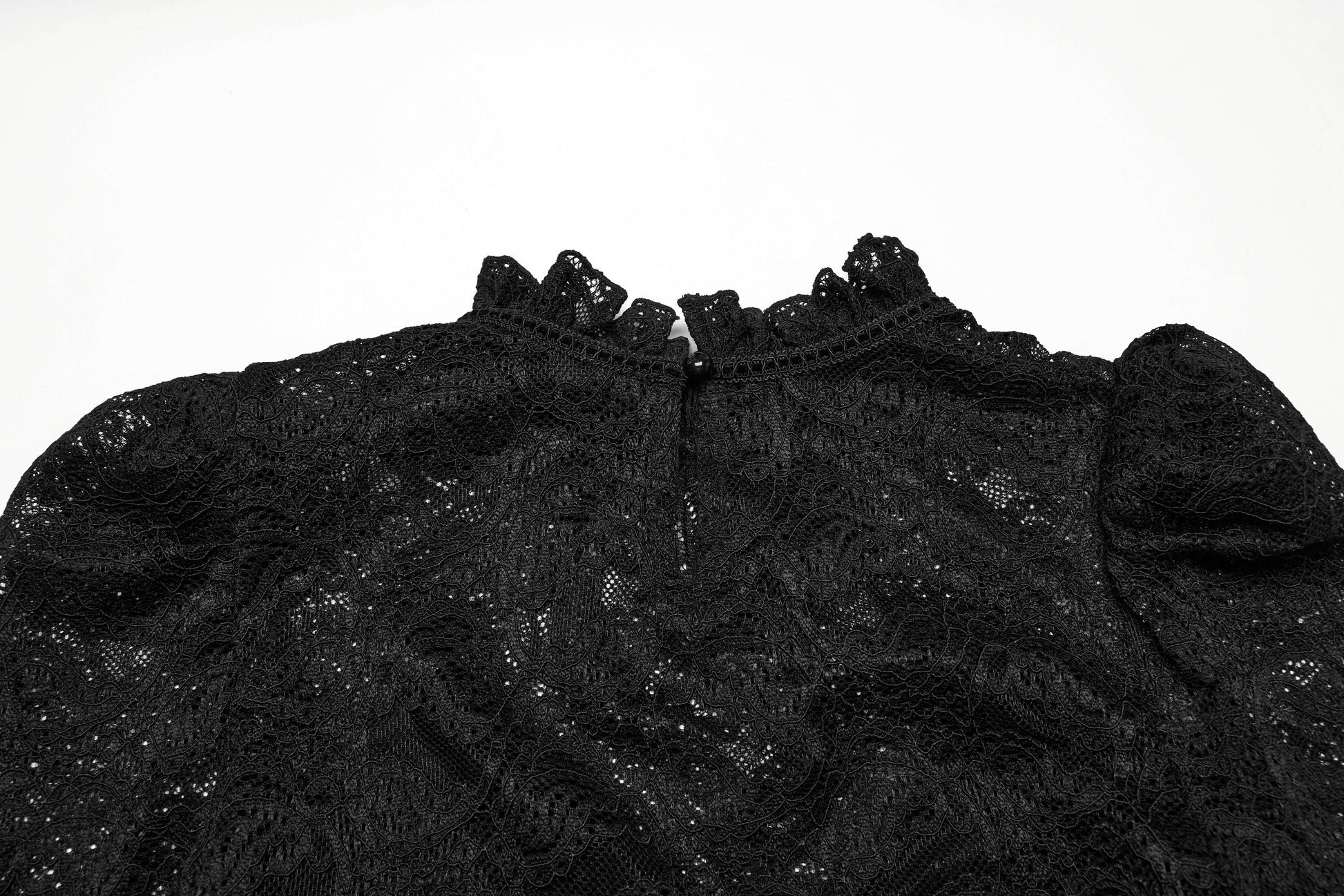 Rock the perfect balance of comfort and style with the Punk Rave Calantha Lace T-Shirt! Made with soft lace and modal fabric, this tee features an elegant ruffled stand collar and bubble sleeves. The pleated waist enhances your shape, while the wavy edges add a touch of edginess. Features a convenient neck split design for easy dressing. Who says you can't be comfortable and fierce?