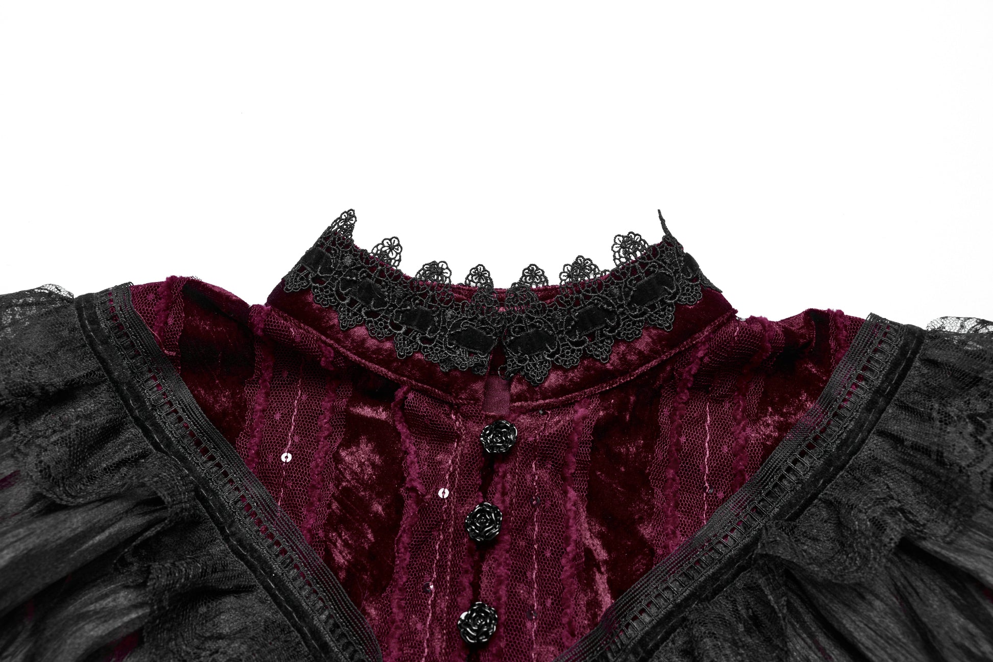 Add a regal finishing touch to your outfit with the Punk Rave Elysia Velvet Ruffle Goth Shawl in Crimson. Crafted from soft, elastic velvet in a rich crimson hue, this dramatic shawl features a layered ruffle trim in contrasting black for a striking gothic aesthetic.
