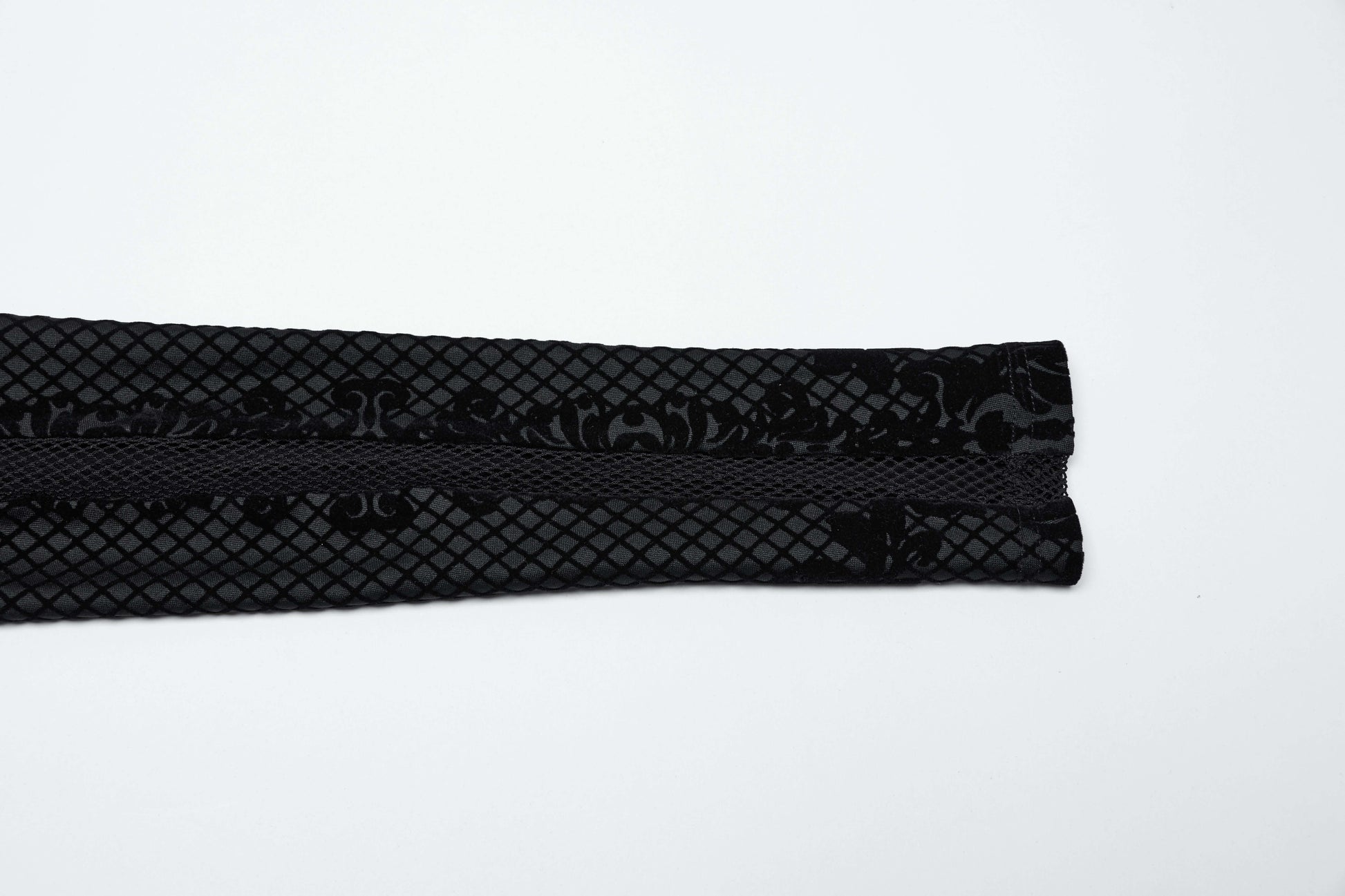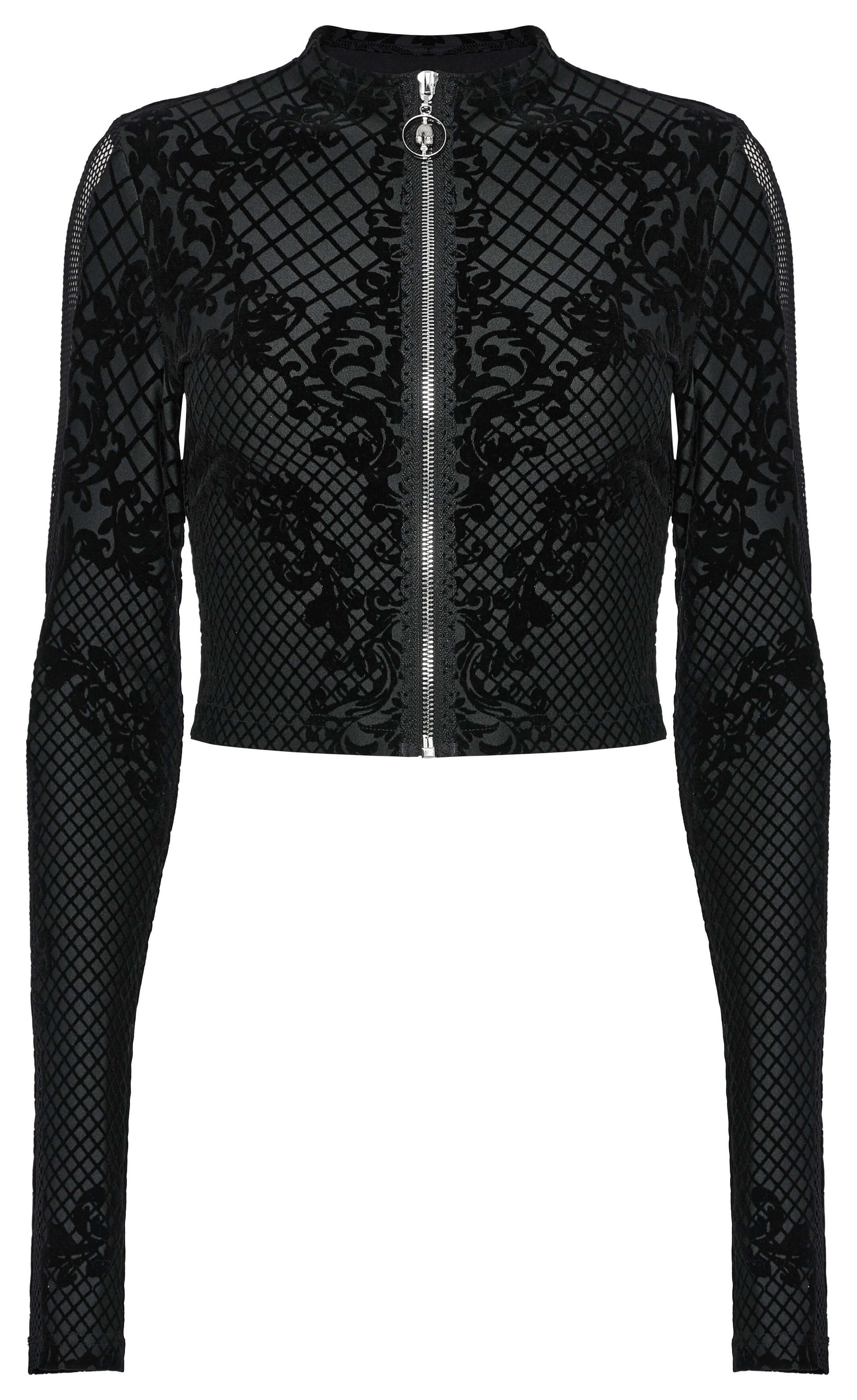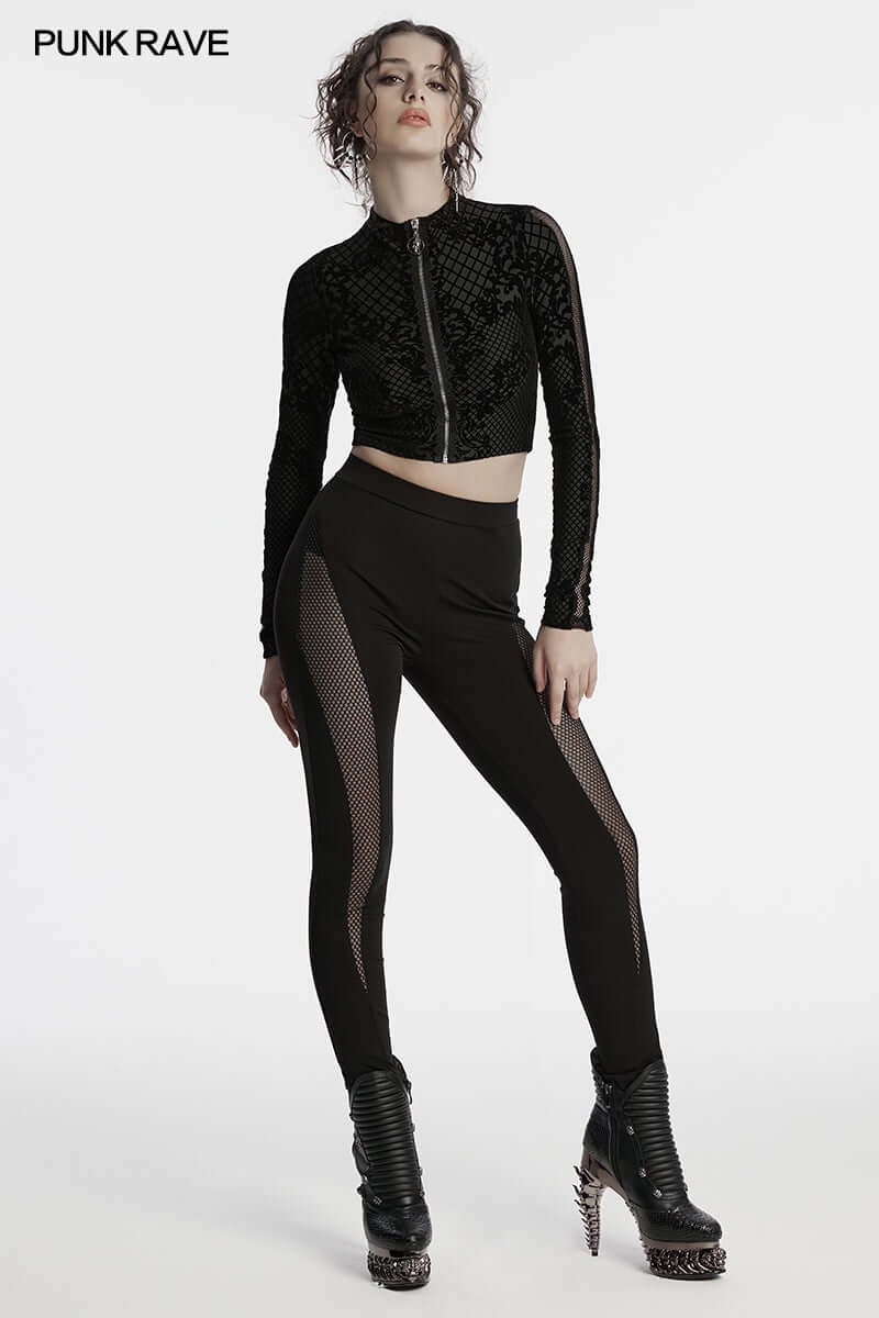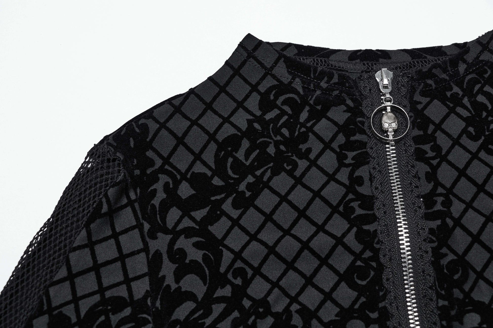 Get ready to rock out with the Punk Rave Enya Printed Cropped Jacket! This short, black coat is made of elastic flocking mesh and printed knit fabric, giving it a unique and edgy look.