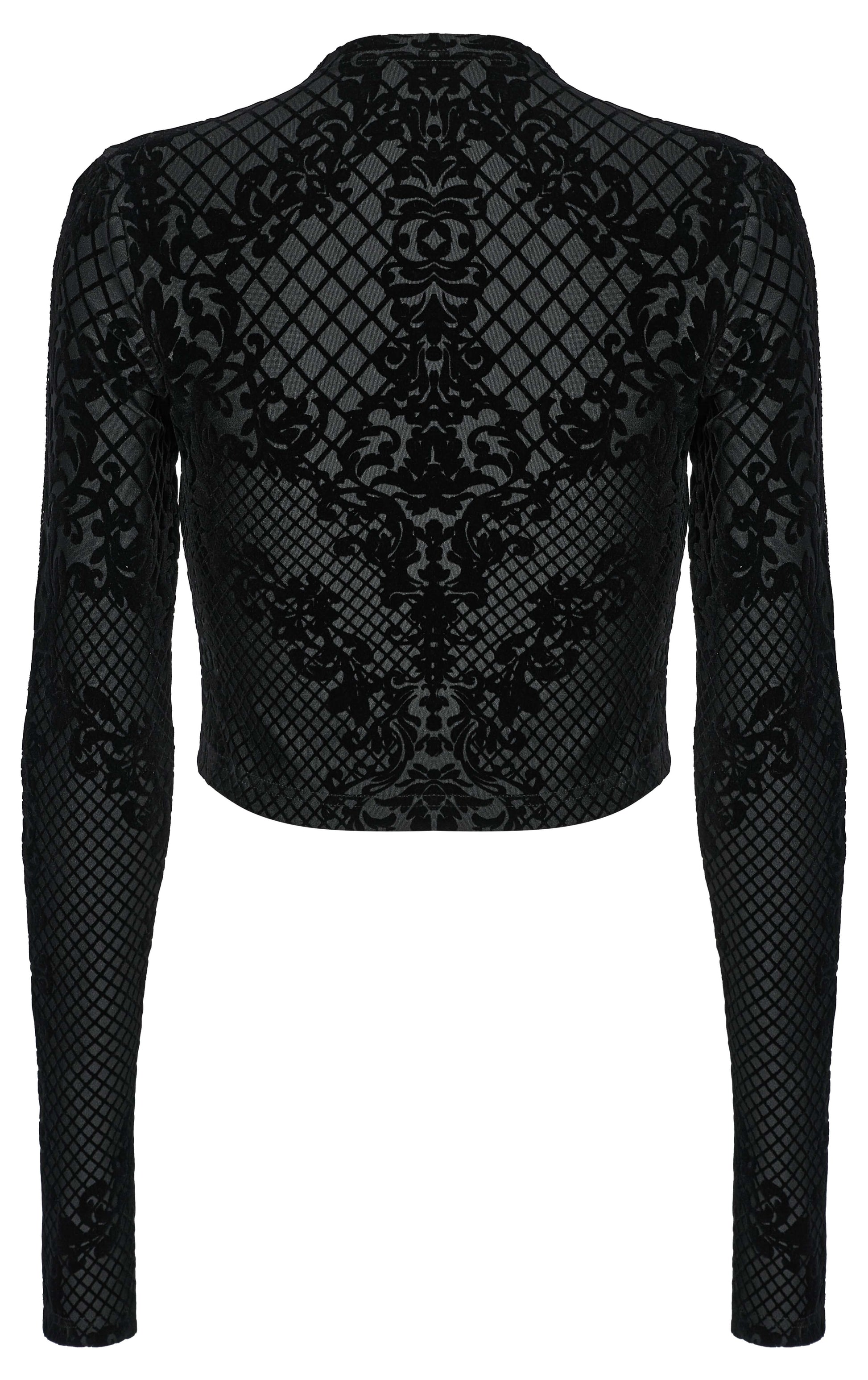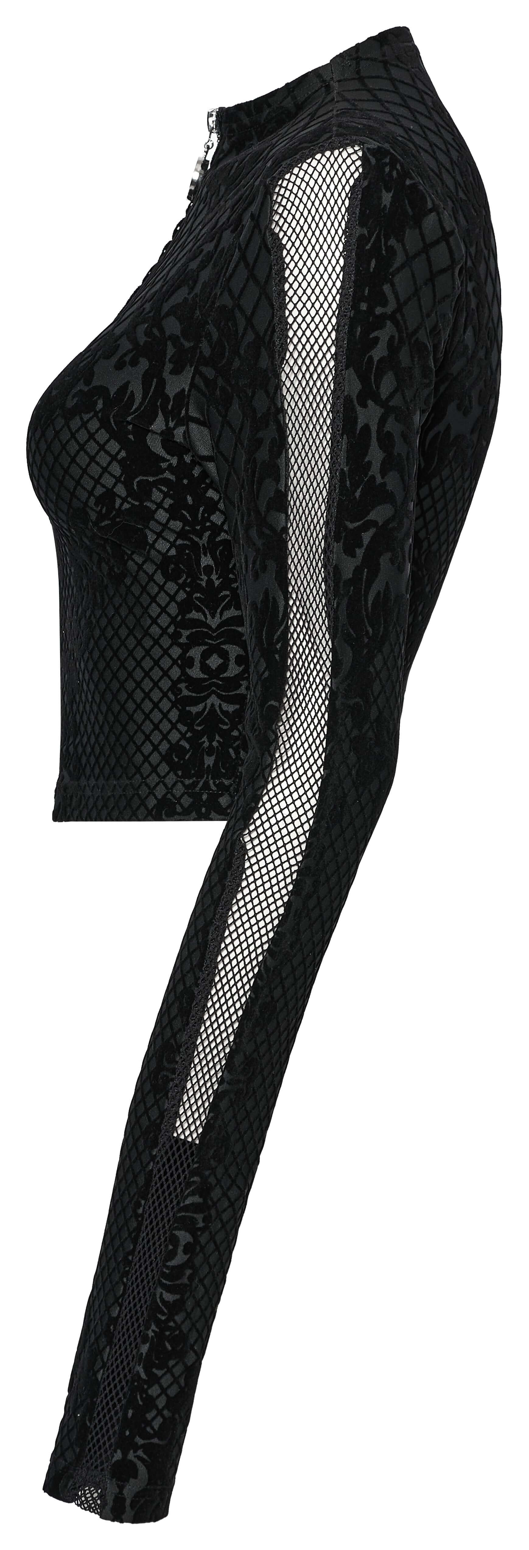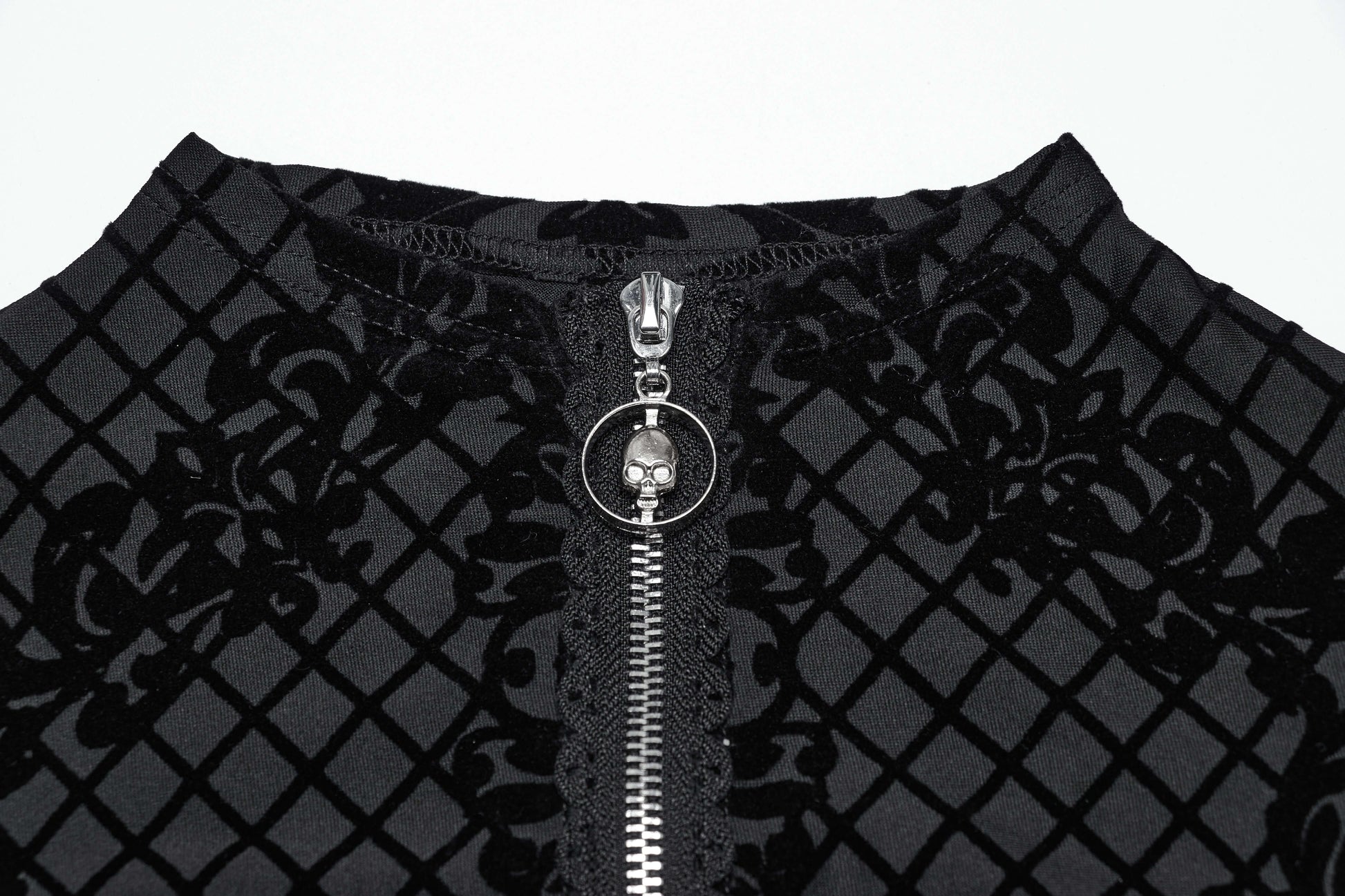Get ready to rock out with the Punk Rave Enya Printed Cropped Jacket! This short, black coat is made of elastic flocking mesh and printed knit fabric, giving it a unique and edgy look.