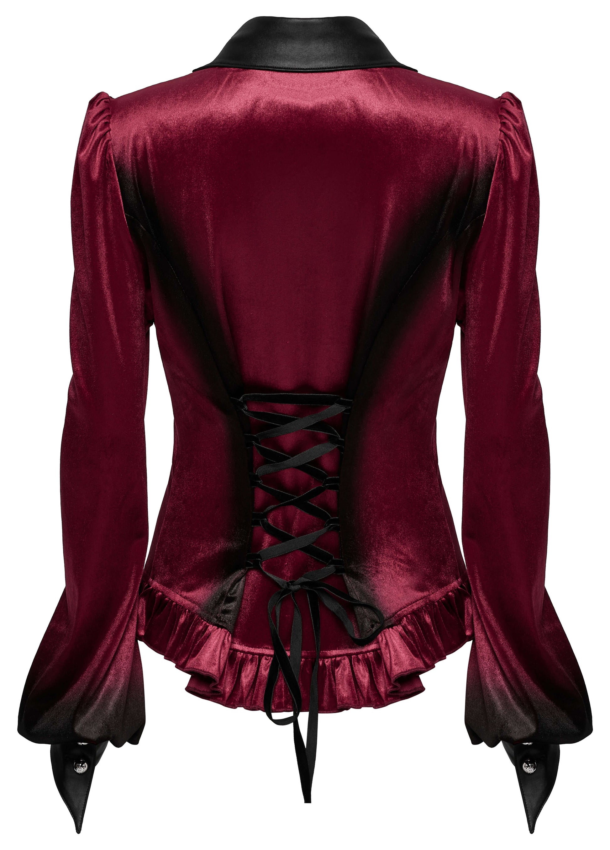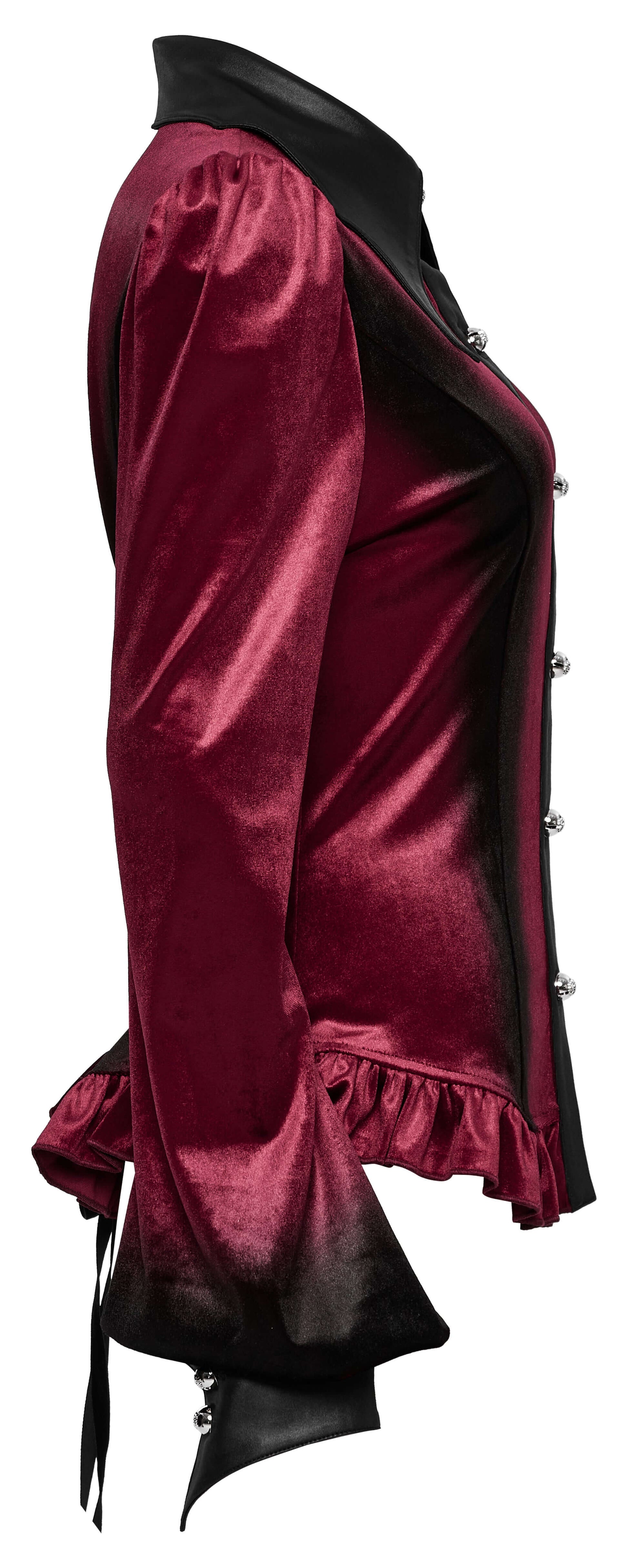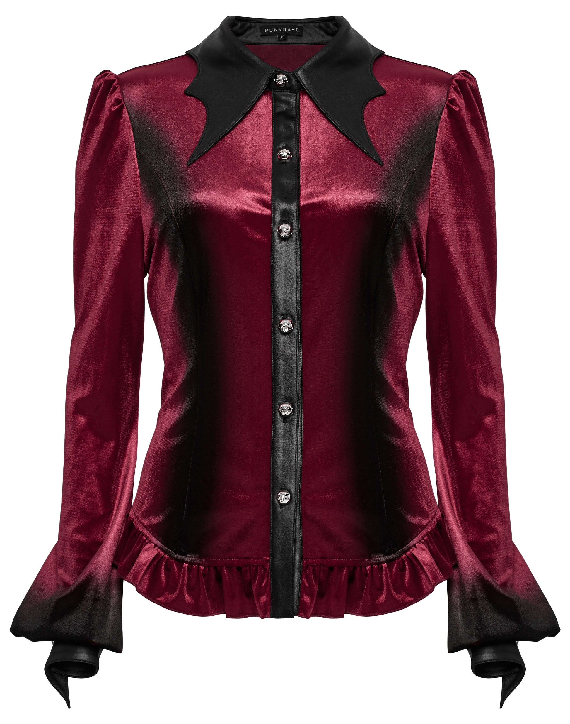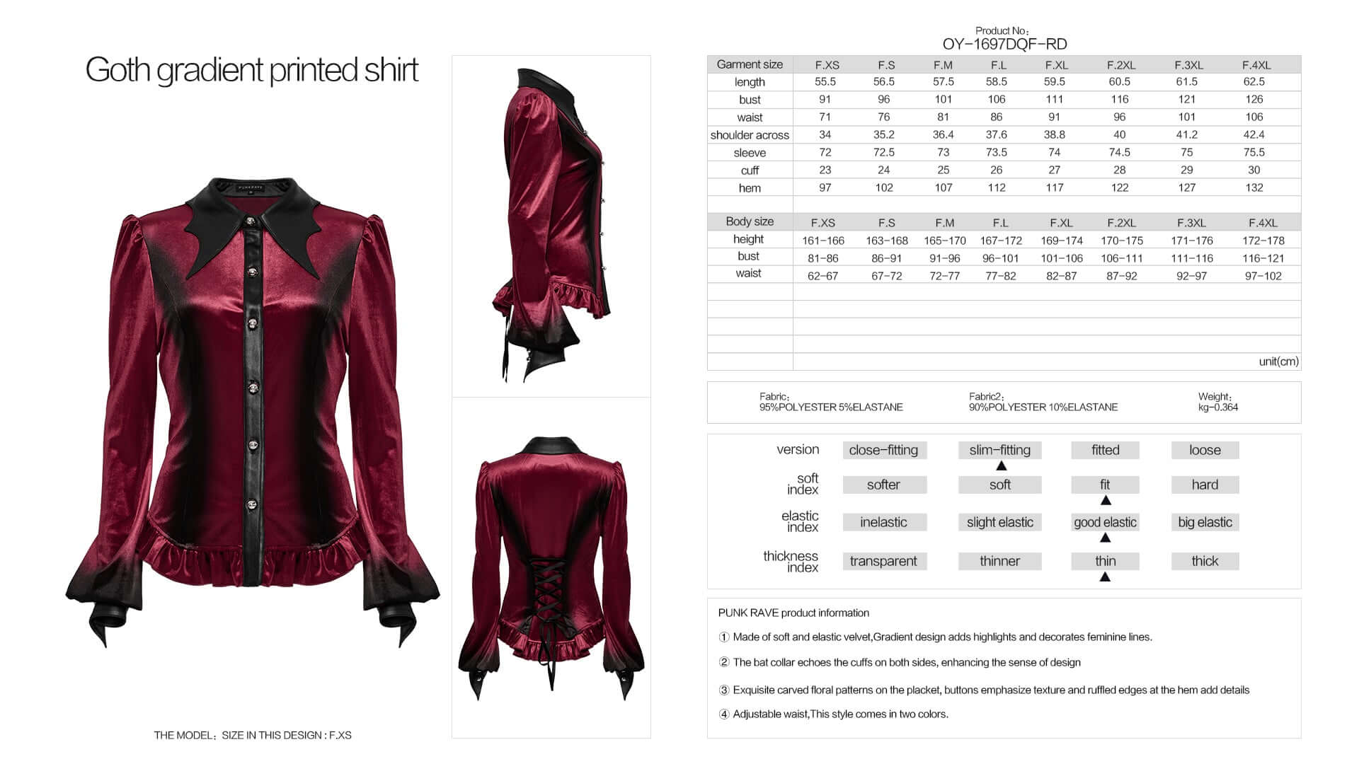 Get ready to turn heads with this soft and elastic velvet Punk Rave Fawn Gradient Printed Shirt! The gradient design enhances feminine lines while the bat collar echoes the cuffs, adding a playful touch. Detailed with carved floral patterns, buttons, and a ruffled hem, this shirt is both stylish and comfortable. Plus, the adjustable waist ensures the perfect fit!