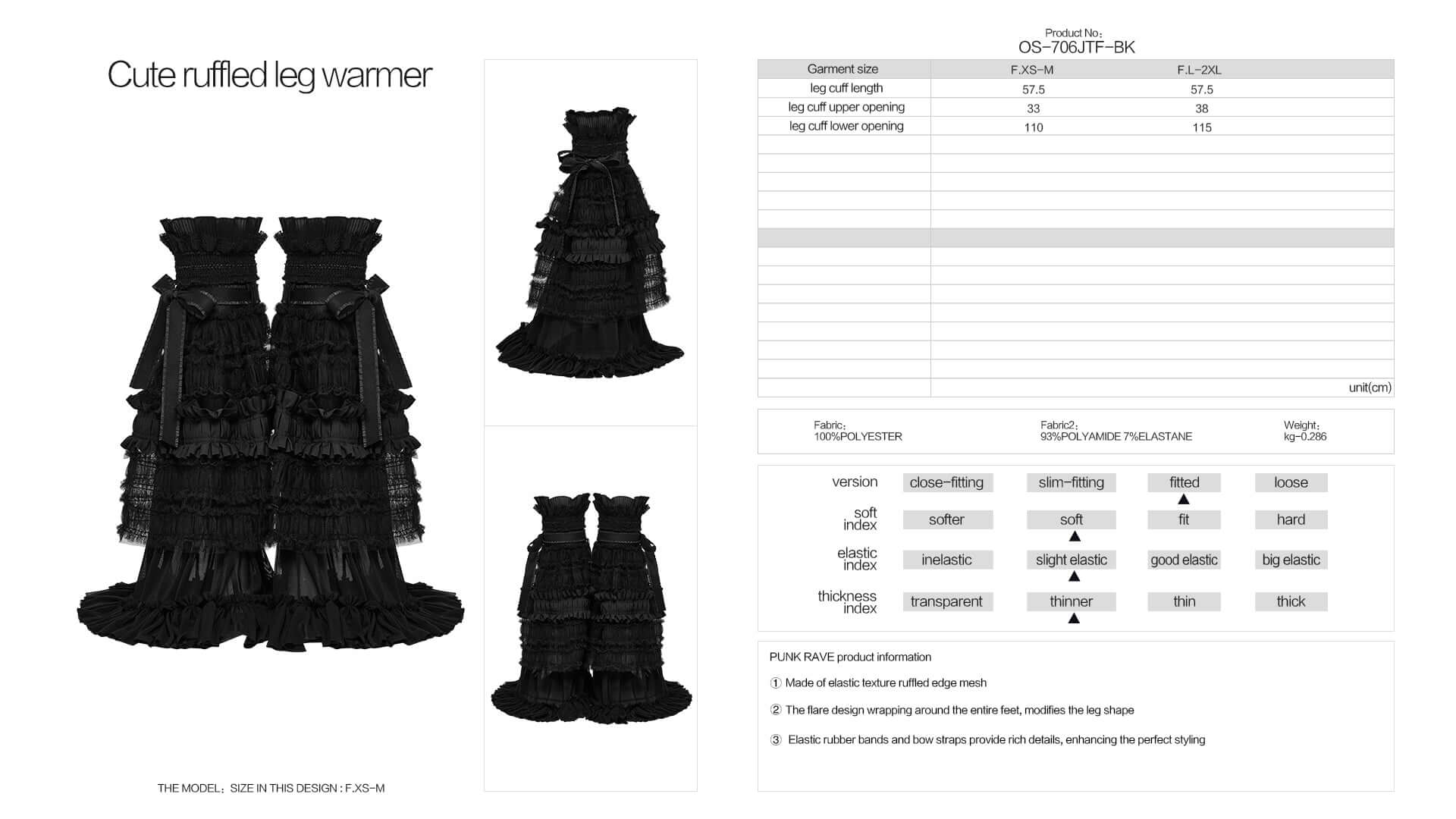 Transform your legs into works of art with the Punk Rave Kesia Cute Ruffled Leg Warmer. Made from elastic ruffled edge mesh, these leg warmers are both stylish and functional, modifying the shape of your legs. The flare design adds a touch of flair, while the elastic rubber bands and bow straps add rich details. Available in classic black.