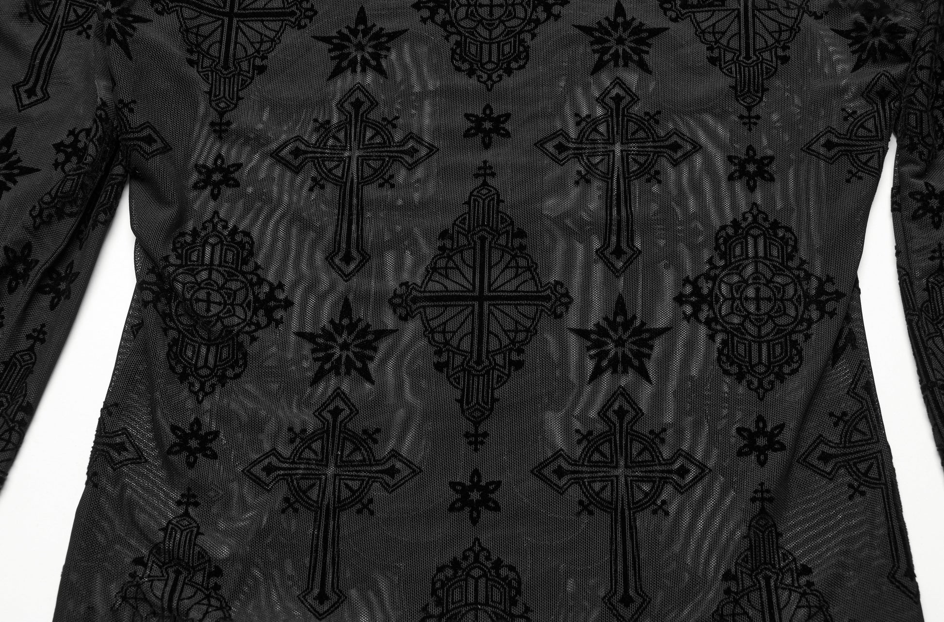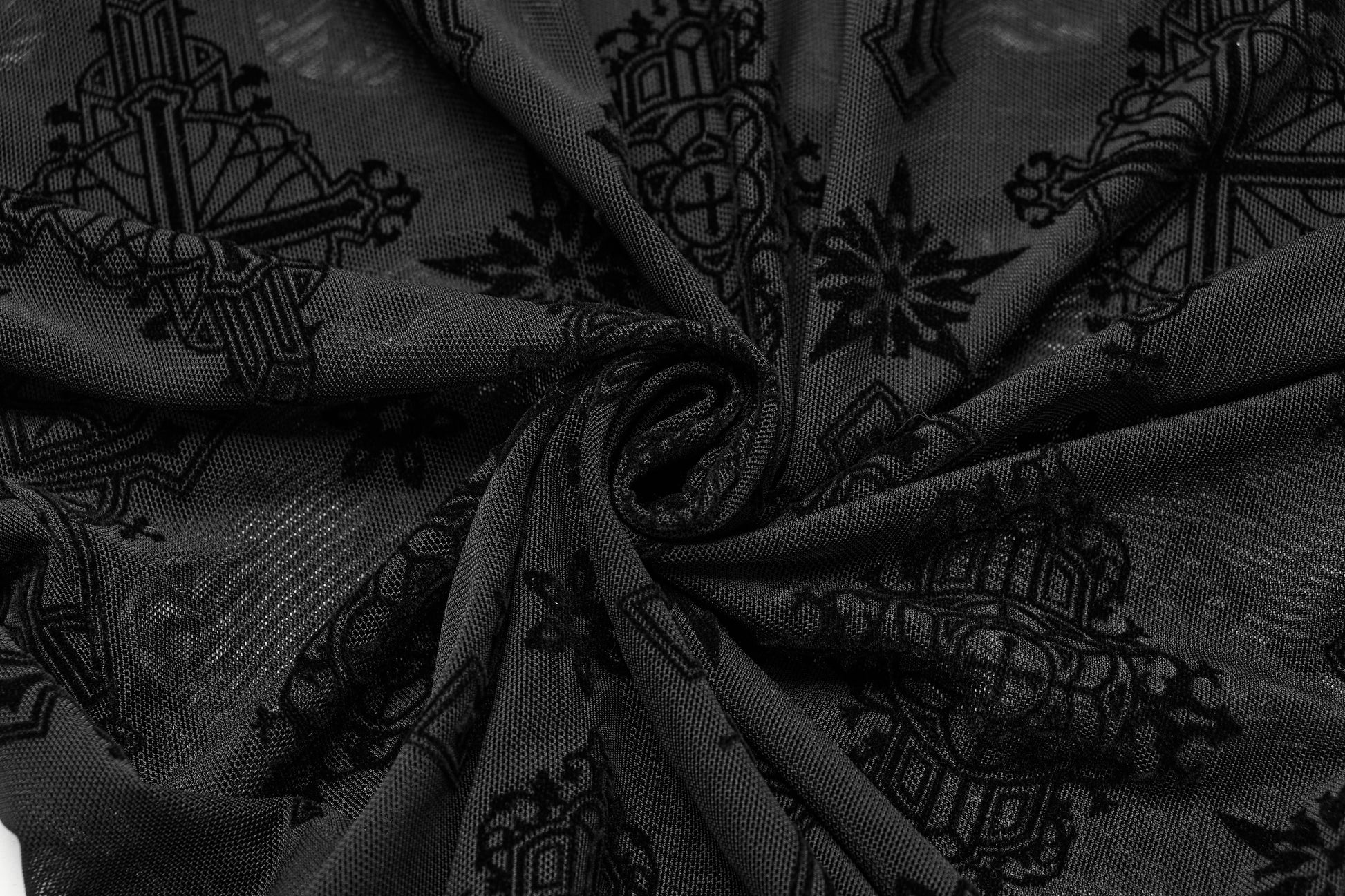 Step into dark sophistication with the Punk Rave Morrigan Cross-Embroidered Mesh Top, a striking blend of sheer allure and symbolic design. Crafted from elastic mesh with an all-over flocked cross pattern, this slim-fitting top commands attention with its large central embroidered cross framed by intricate motifs.