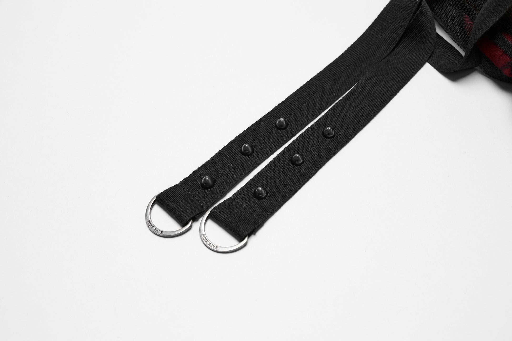 The design is elevated with adjustable studded webbing straps on both sides, allowing you to gather the fabric for a custom draped effect and endless styling possibilities. Perfect for statement-making alternative outfits.