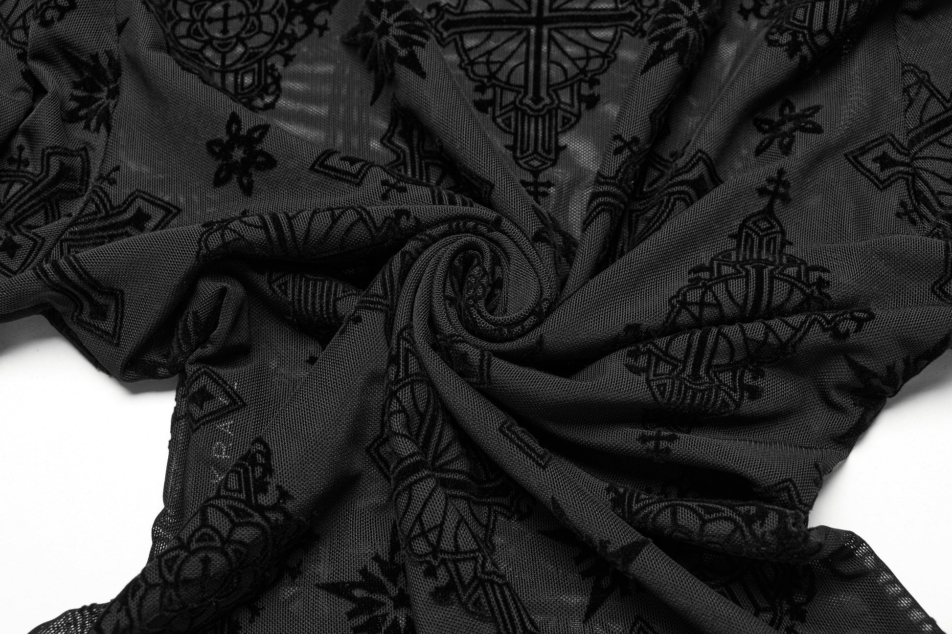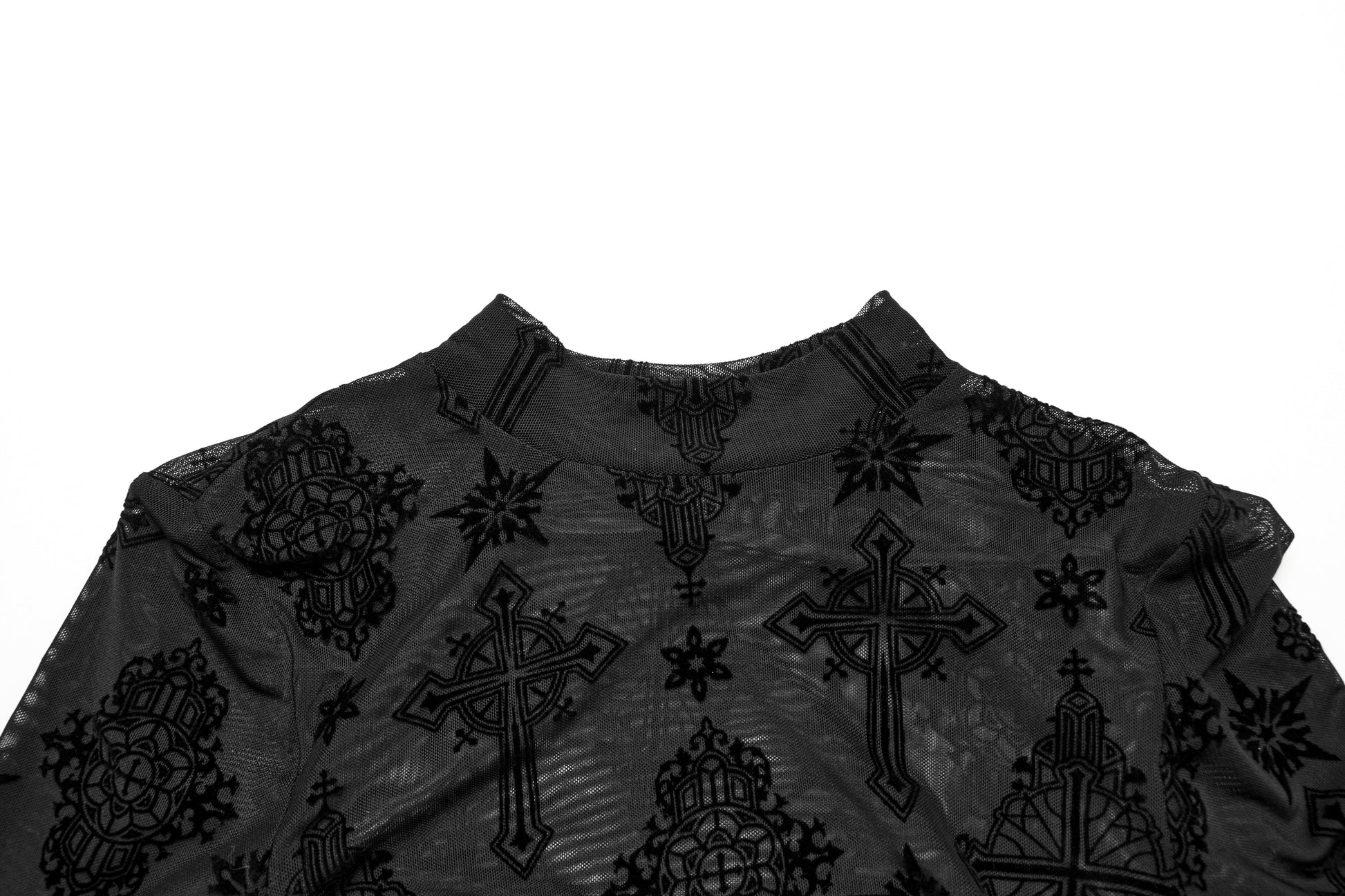 Command attention with the Punk Rave Ravena Cross Flocking Mesh Top, a sheer statement piece for lovers of dark, intricate design. Crafted from elastic mesh adorned with bold flocked crosses and ornate motifs, this slim-fitting top combines sensual transparency with gothic symbolism.