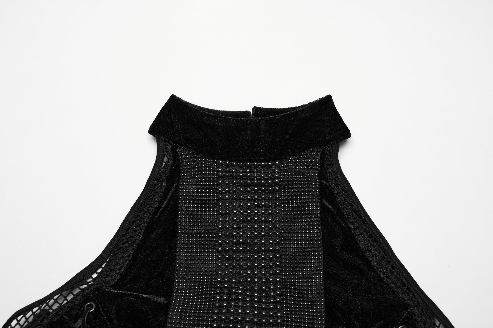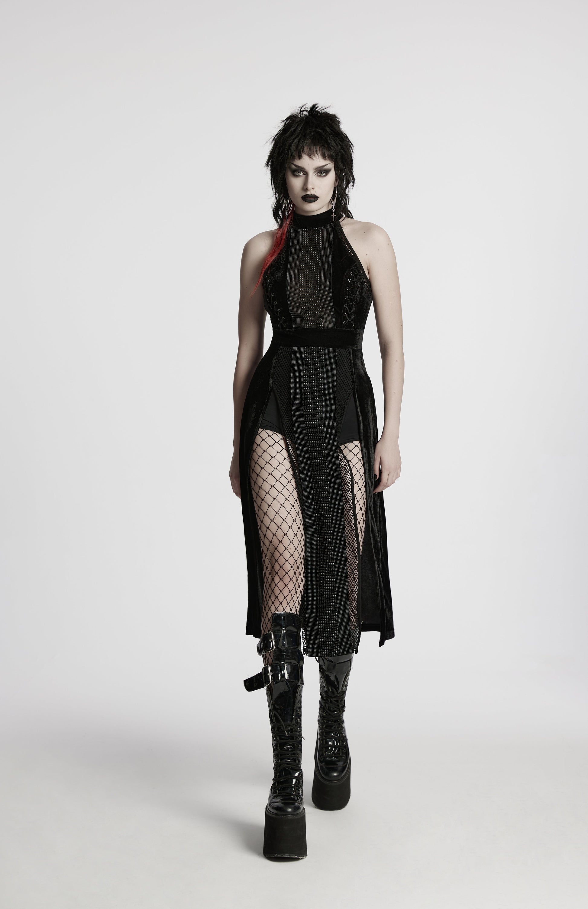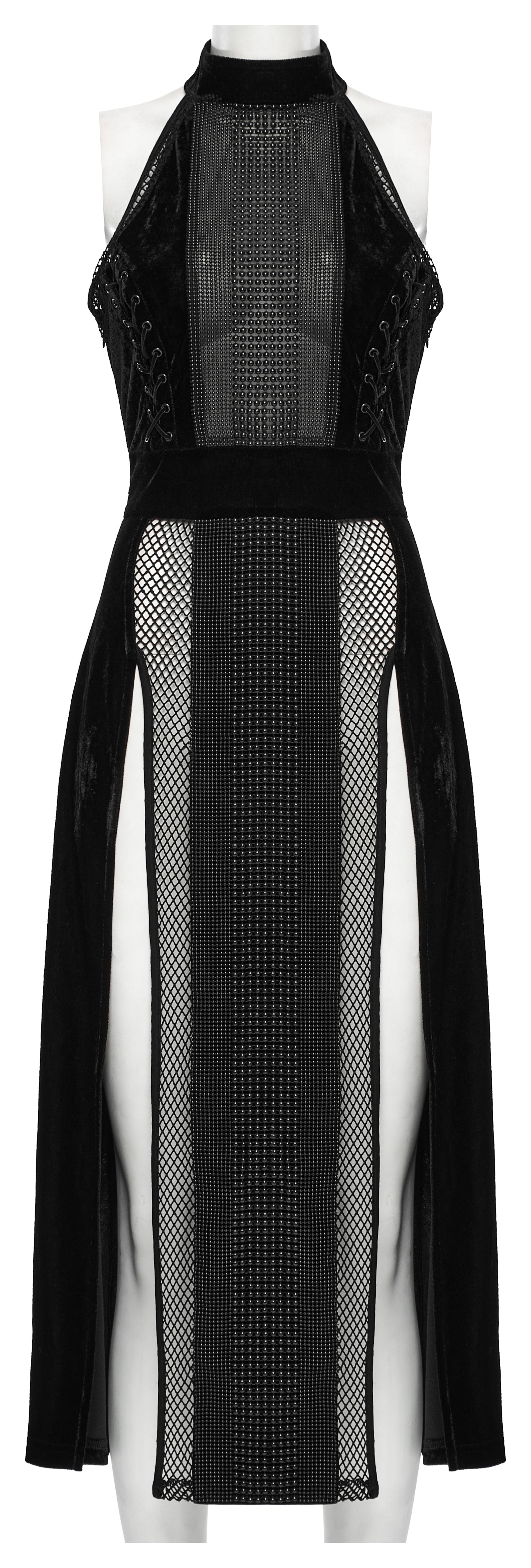 Turn heads at any dark soirée with the Punk Rave Selene Velvet Mesh High Slit Goth Dress in Black. This striking gown is crafted from high-quality elastic velvet and sheer mesh for a luxurious yet daring effect. The halter neck design creates a sleek, minimalist silhouette, while the front showcases intricate bead decorations for an eye-catching focal point.