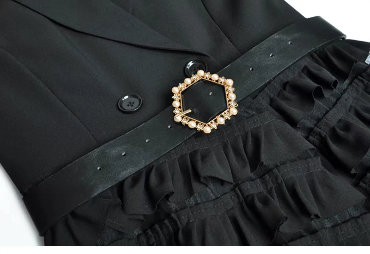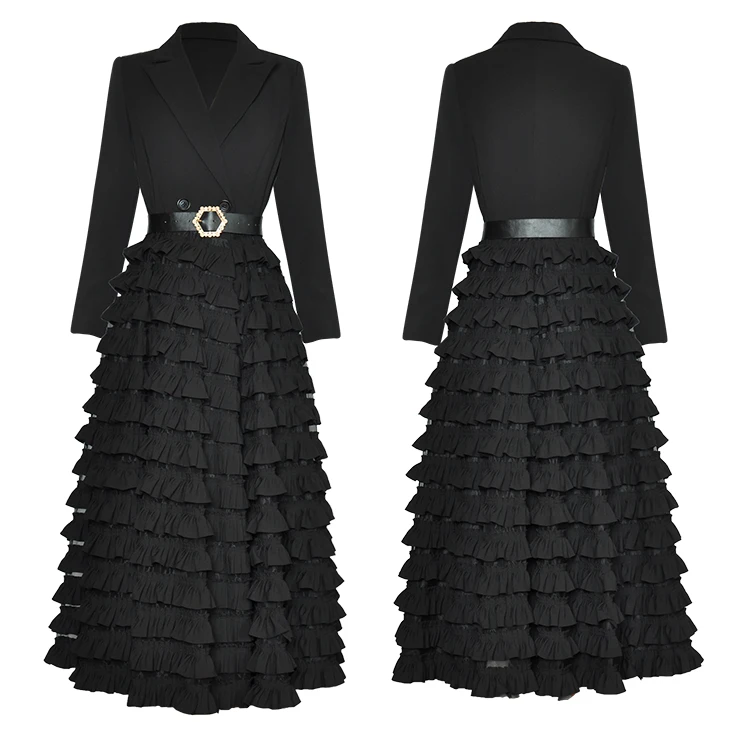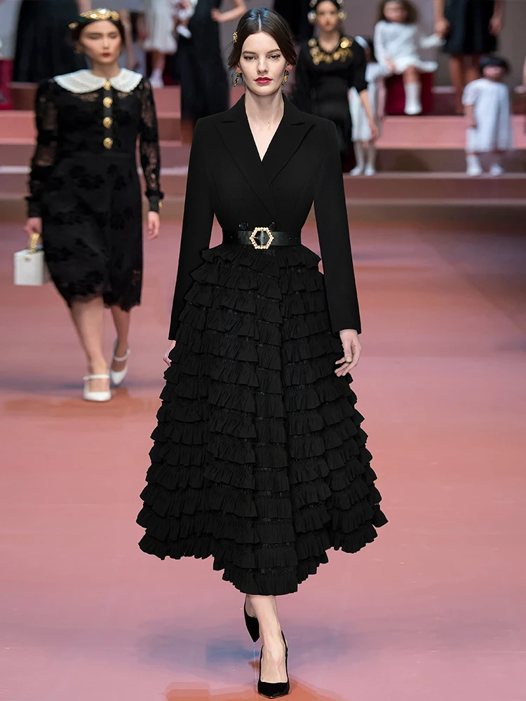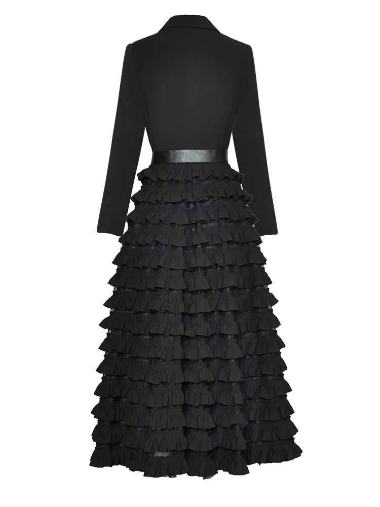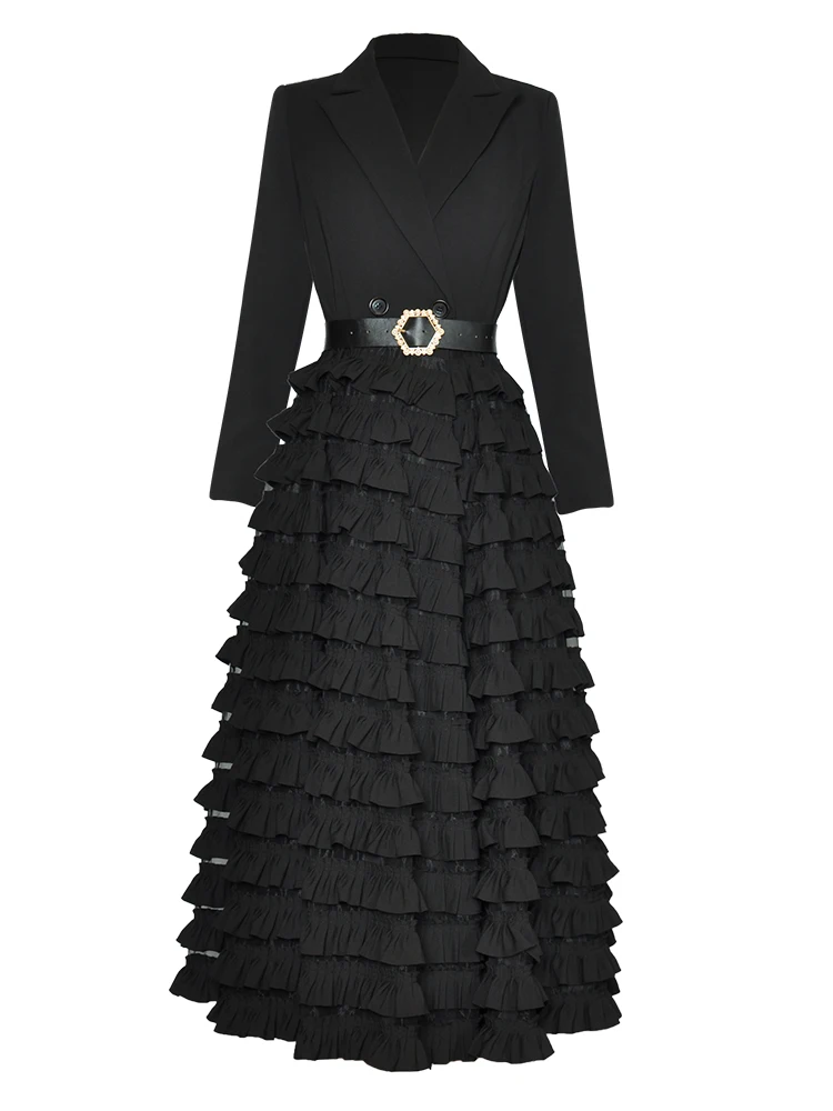 Vireous Black Suit-Collar Tiered Maxi Dress, Winter Catwalk Collection