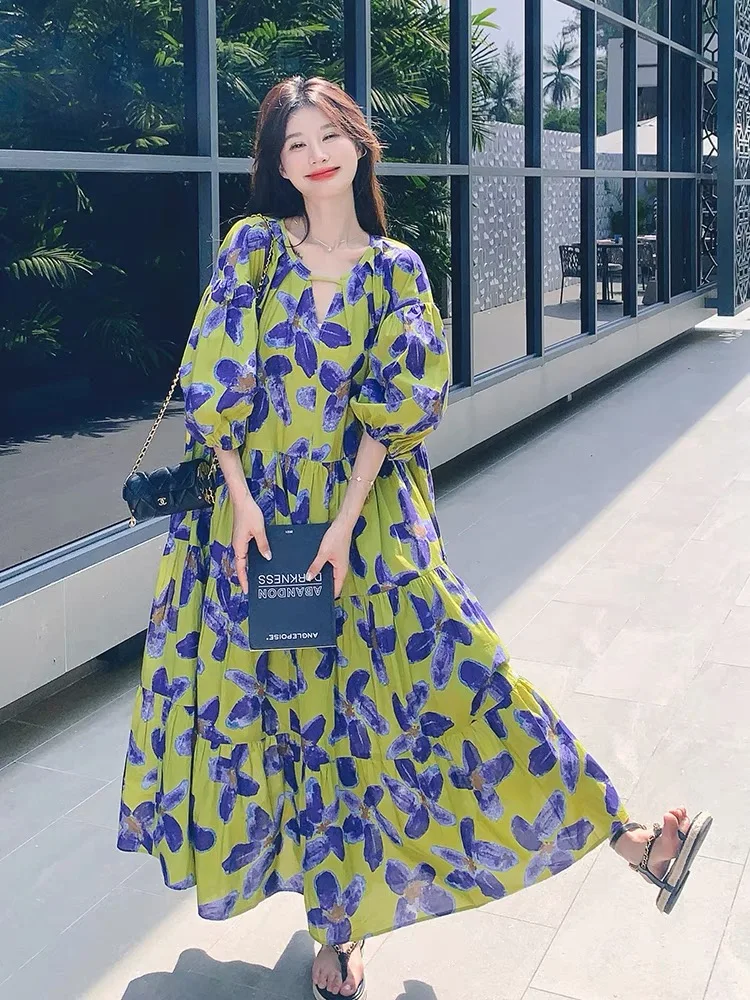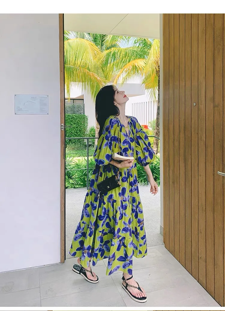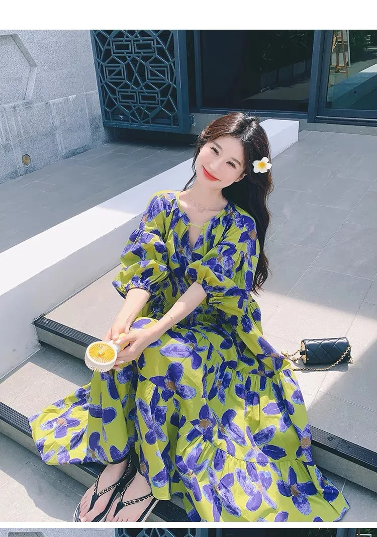 Here is our beautiful floral print temperate weather slouchy dress. Super light and floaty with flattering v-neck, big swing skirt and lantern sleeves. French-style daily wear with a lime and blue design.