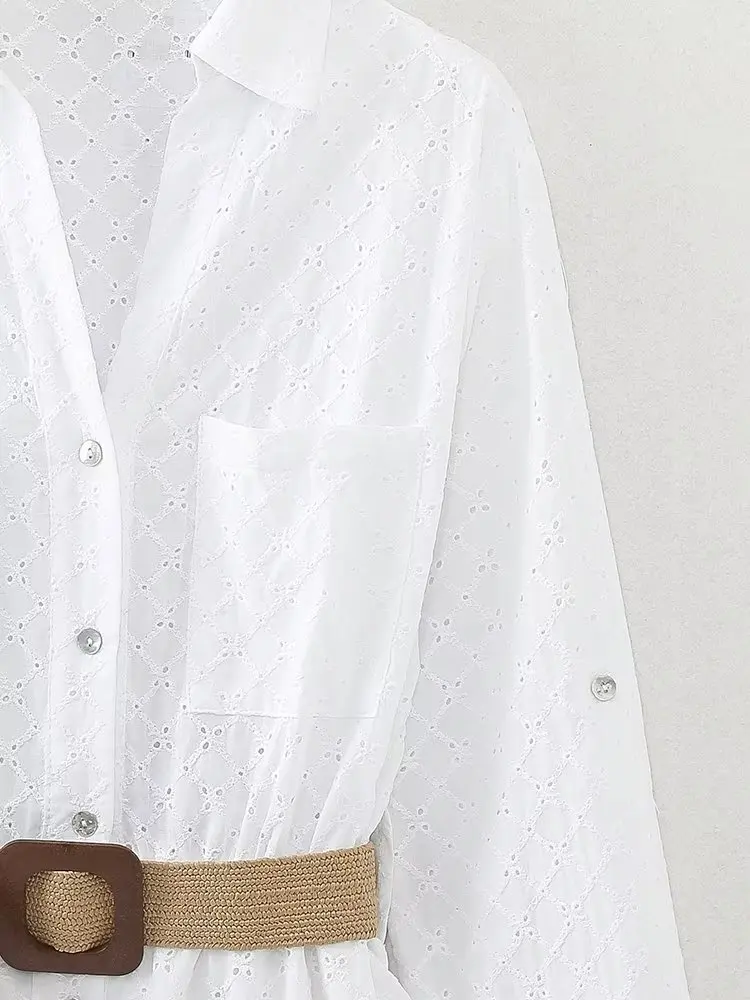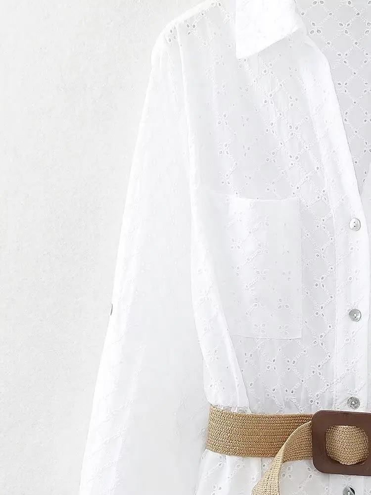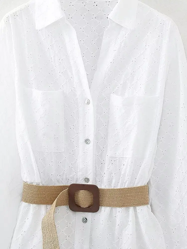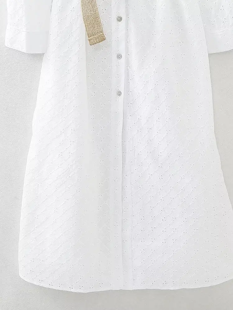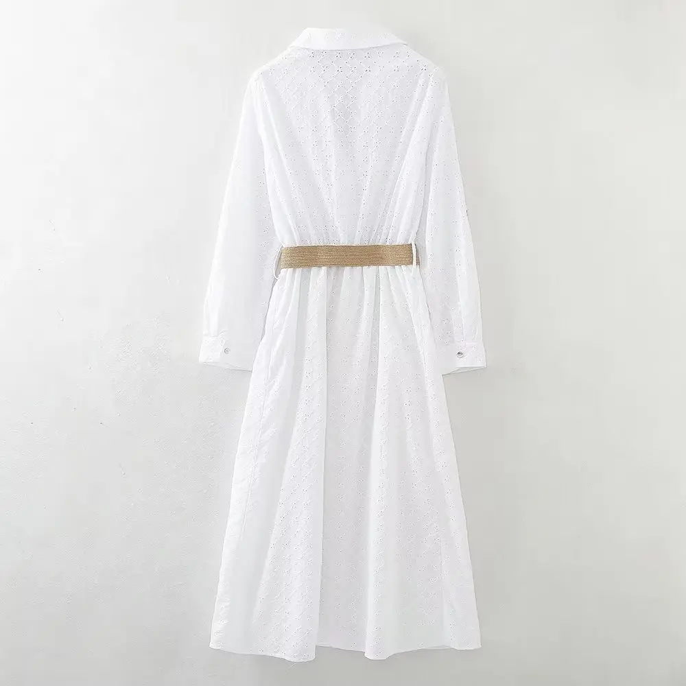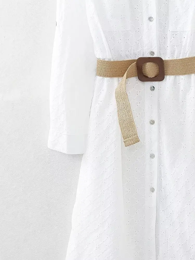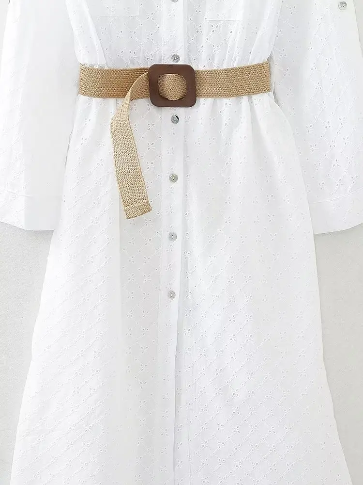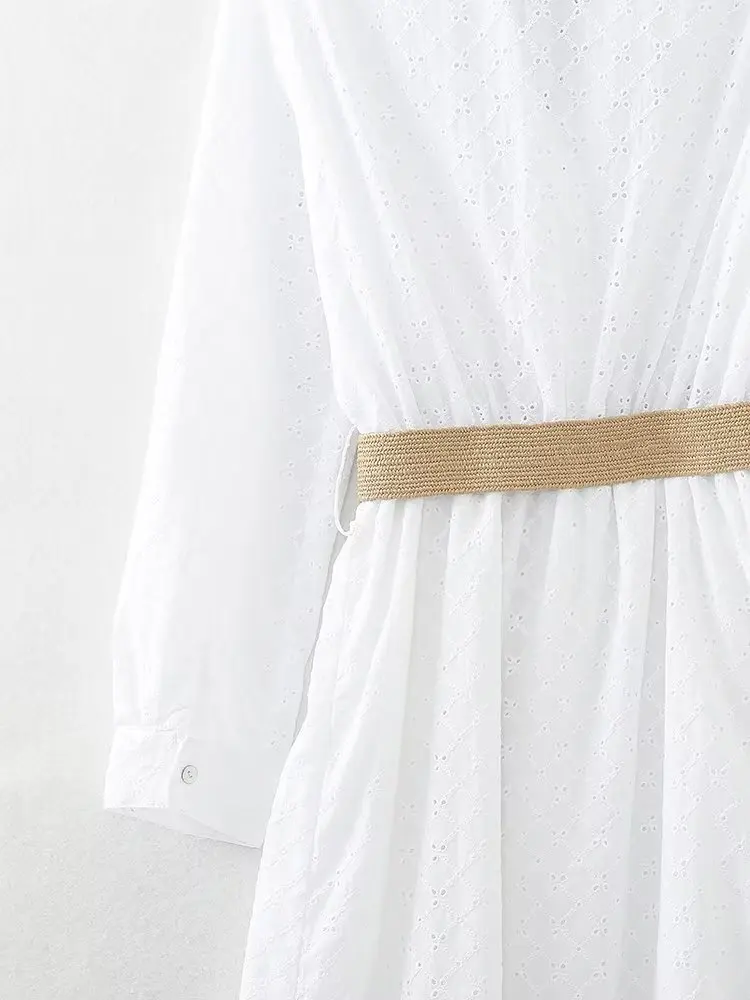 Fashion elegant, frosty white summer dress with belt. Timeless country house style.