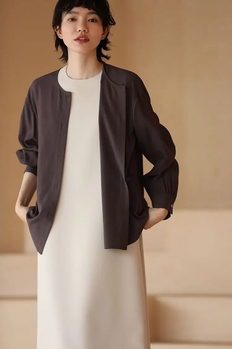 This minimalist square sillhoutte dress is pure zen and understated elegance, The material is soft polyester twill.